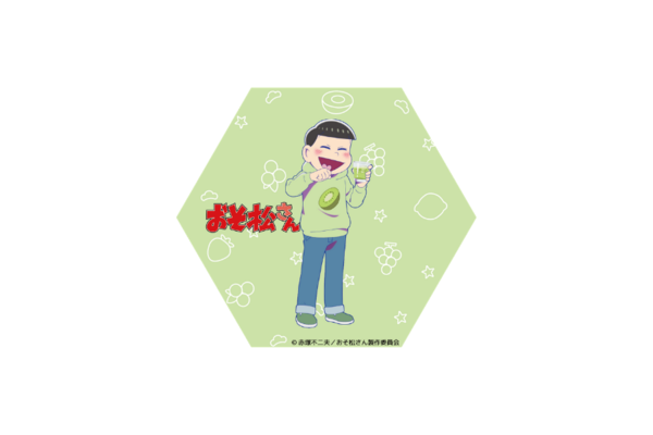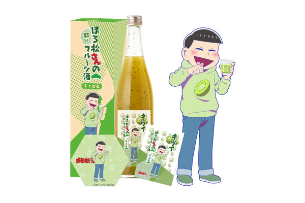 フルーツの飲み物だからついつい飲み過ぎちゃう!?いつの間にか「ほろ酔い」になっている「チョロ松」のテーマカラーの緑色をイメージしたキウイのお酒です。購入特典は、【オリジナルラベルステッカー】と【限定白雲石吸水コースター(六角)】です。
