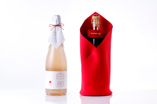 赤色酵母による美しい見た目のスパークリング日本酒「白那 Rose」に、シャープの特殊な蓄冷技術により生み出された蓄冷材を含めたセットです。
