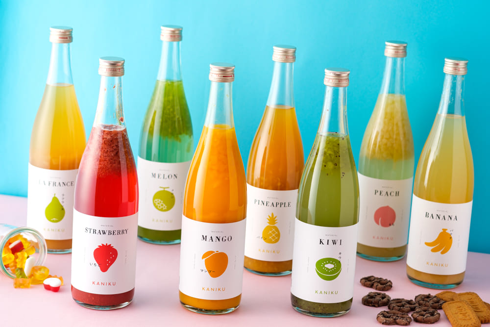 もぐもぐ噛めちゃう贅沢果肉がたっぷり入った、こだわりの果実酒「KANIKU」シリーズ。バナナやリンゴ、イチゴ、パイナップルなど定番の果実のお酒を豊富にそろえています。
