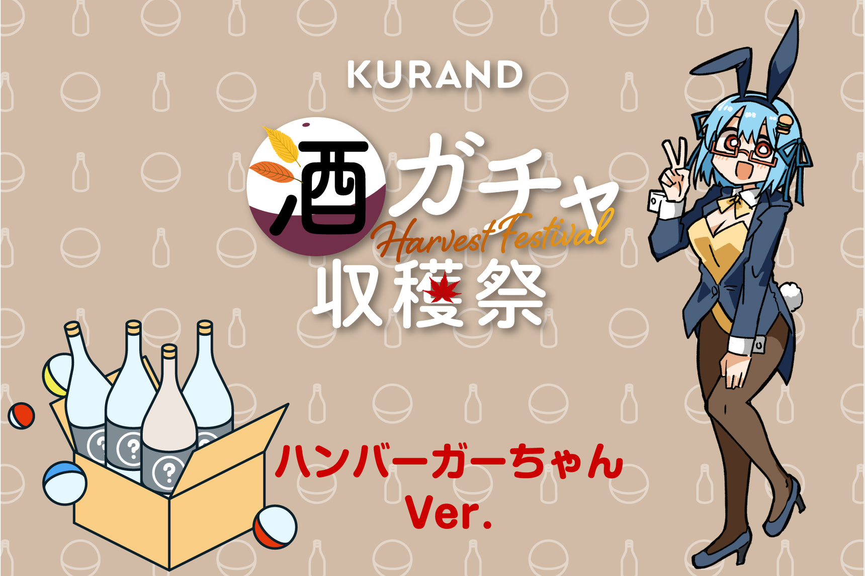 このたび、「ハンバーガーちゃん」と「酒ガチャ収穫祭」のコラボが実現しました!ハンバーガーちゃんセレクトのお酒2本、秋季限定酒1本、KURANDセレクトのお酒1本の合計4本が入った酒ガチャです。