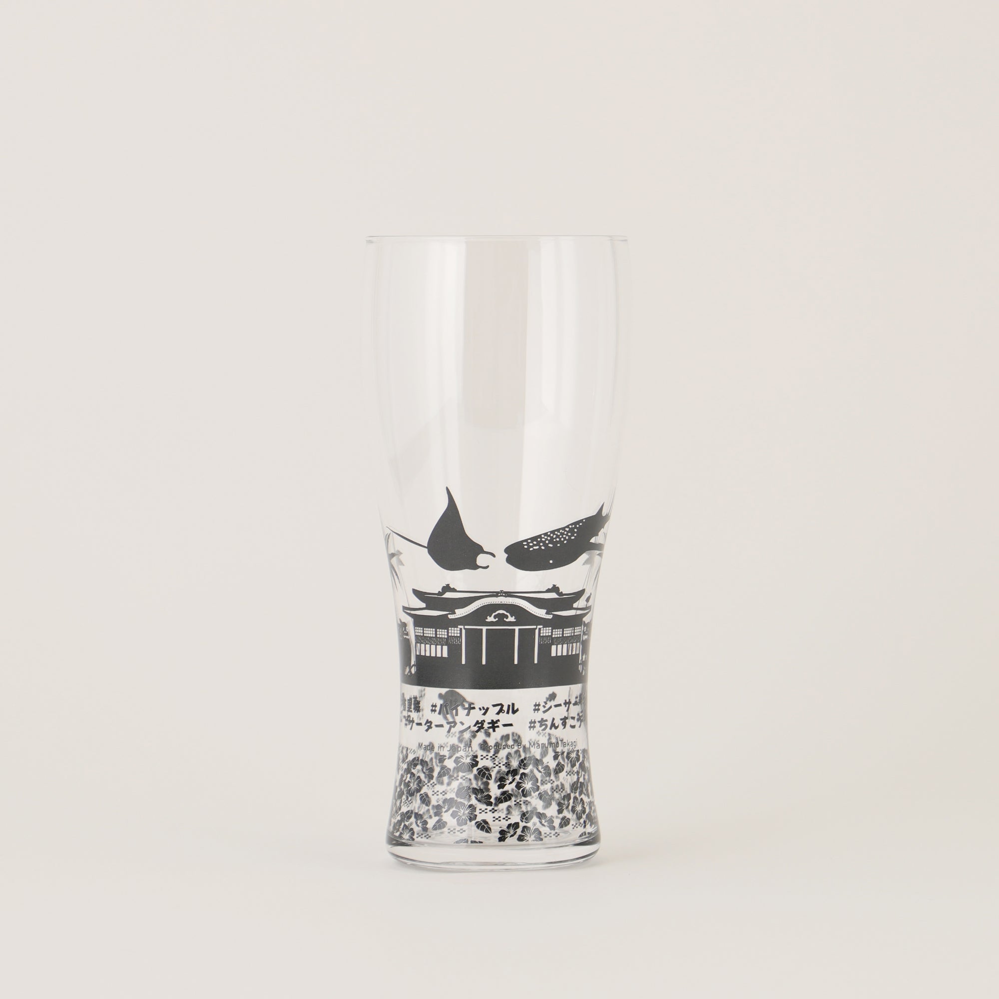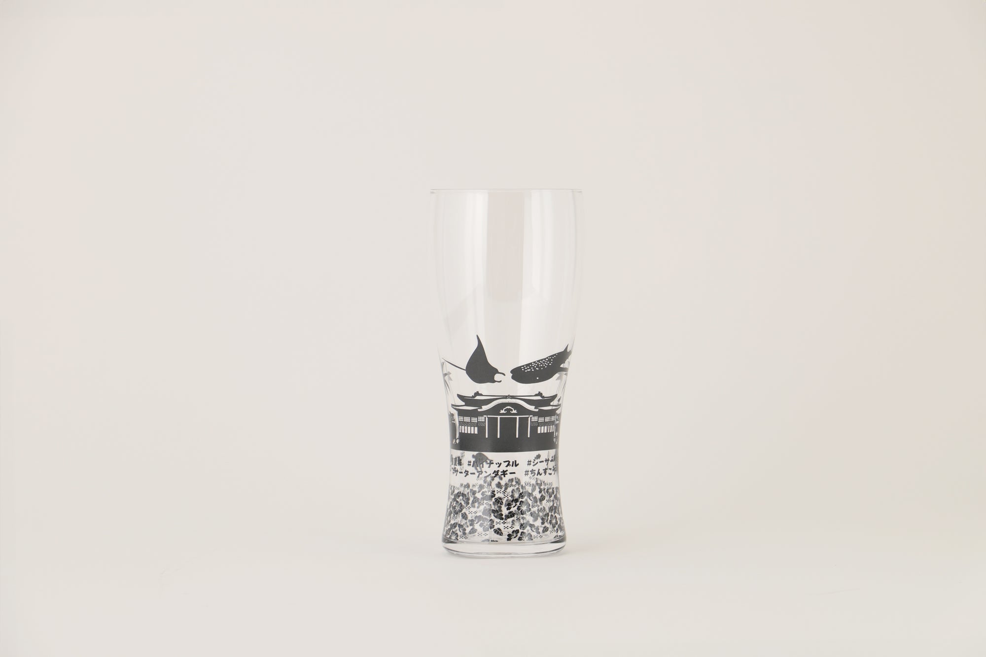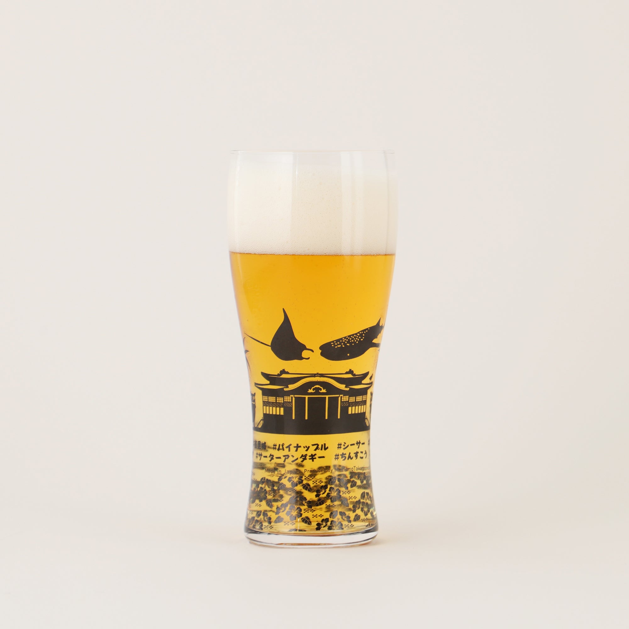 ビールを注ぐと、まるで夕日が輝く景色のように見えるグラス。首里城からジンベエザメまで、ビールを味わいながら沖縄らしい景色を楽しめます。
