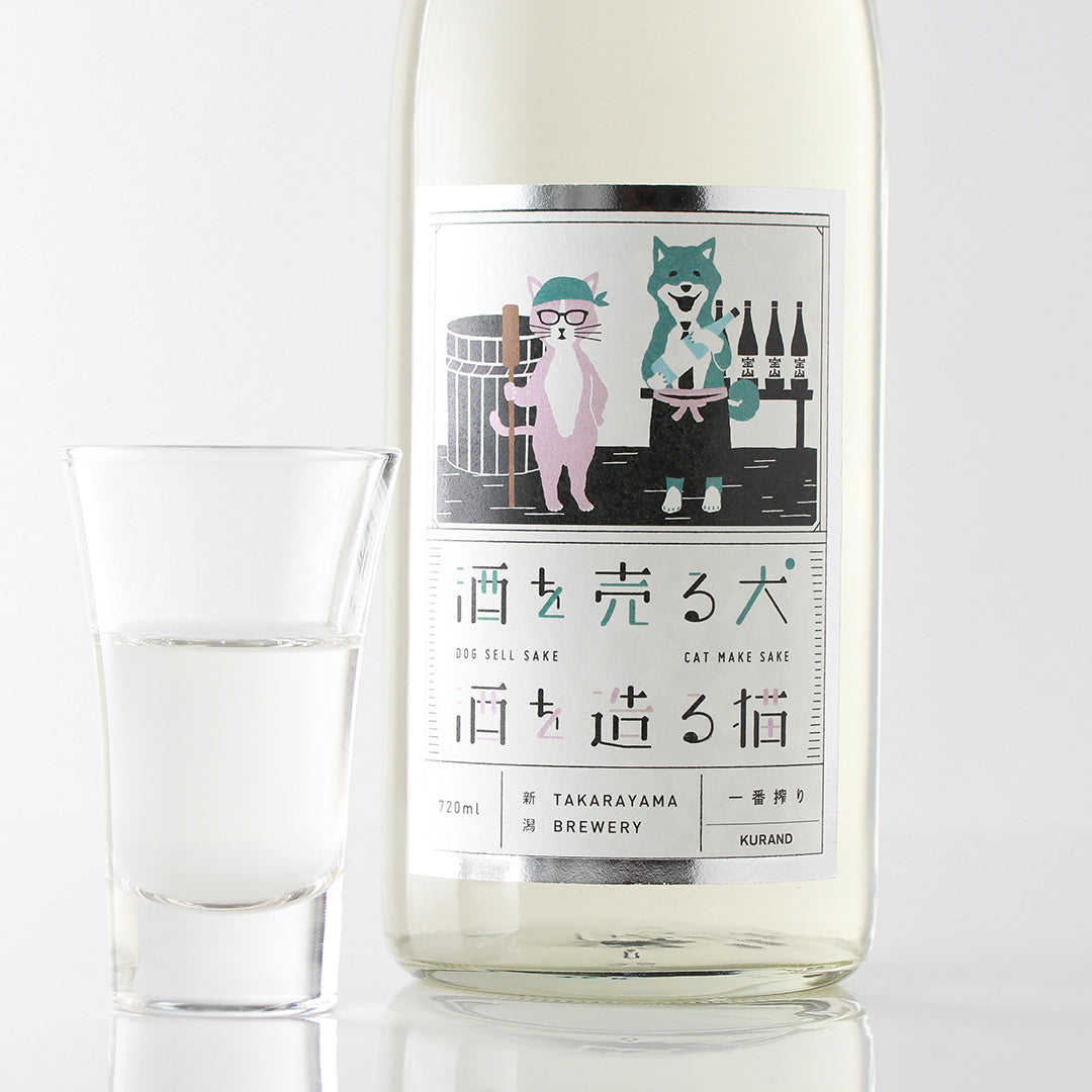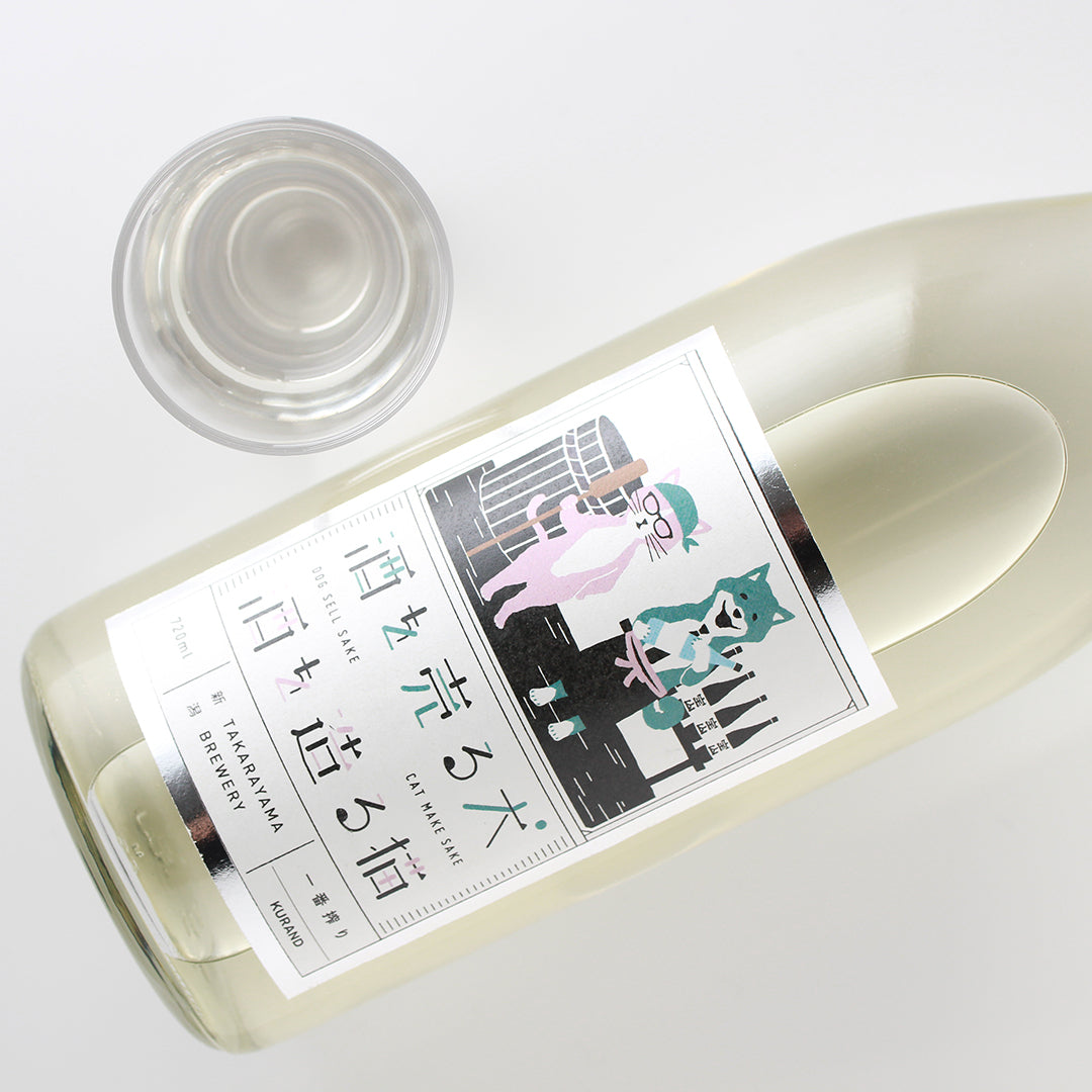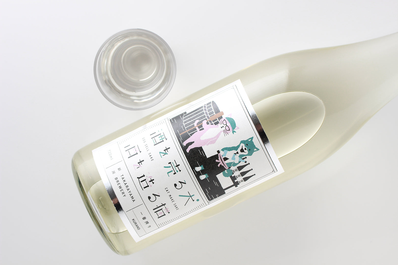 宝山酒造の次期当主の渡邉さんと営業の若松さんは、大学の同級生。宝山酒造には看板猫がいて、かつ渡邉さんが無類の猫好きであること、そして、人懐っこい性格の若松さんが犬に似ていることから、2016年に「酒を売る犬 酒を造る猫」(略称「犬猫」)がブランドとして誕生しました。搾りたての味わいを表現した爽やかなラベルデザインにもぜひご注目ください。