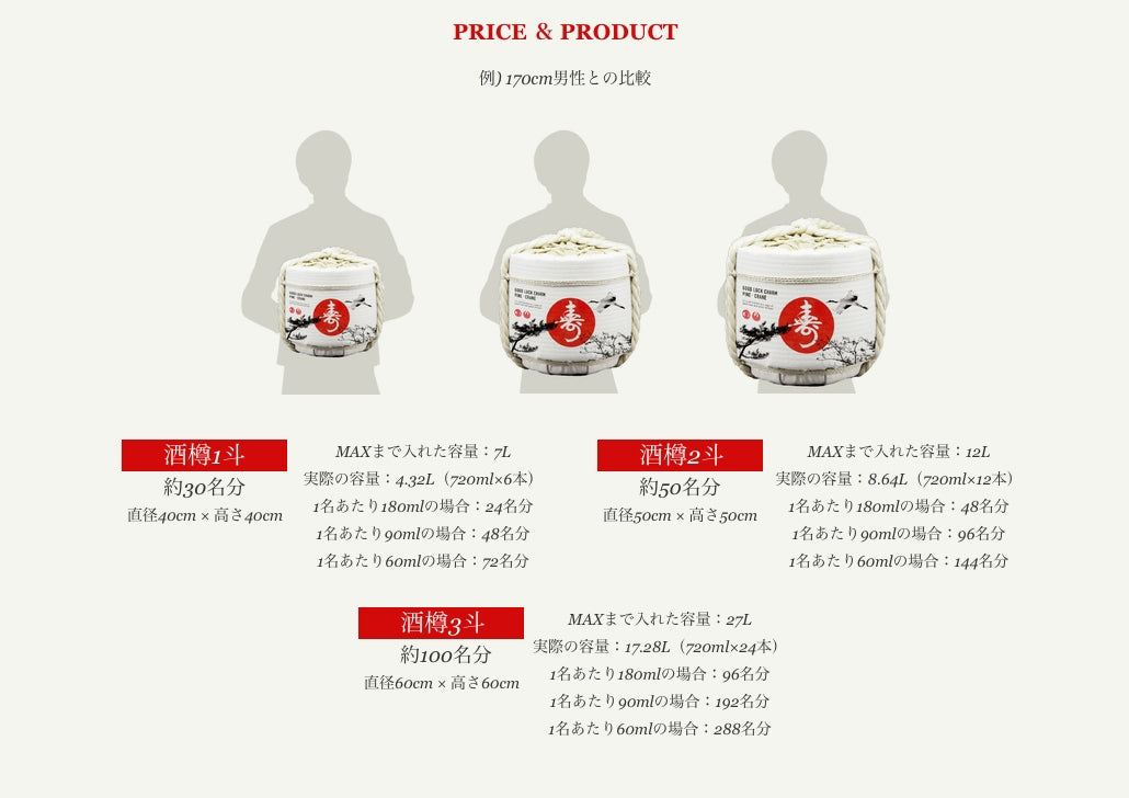 用途、ご参加人数に合わせて、1斗樽・2斗樽・4斗樽の3種類のサイズからお選びいただけます。こちらは4斗樽のご注文ページです。