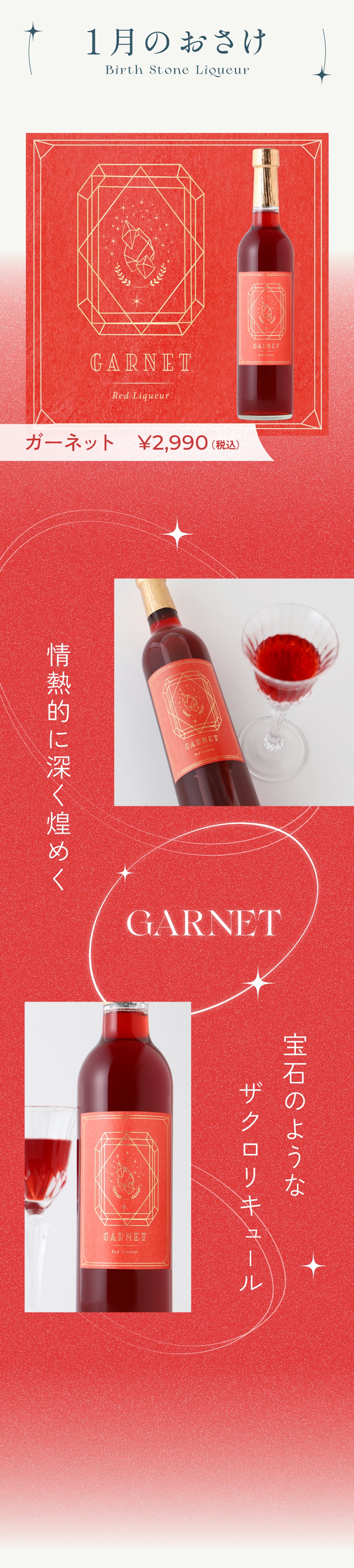 幸運を招くと言われる 誕生石をテーマにした「誕生石のおさけ」月ごとに異なる輝きを持つ、 12種類のお酒シリーズです。 特別な日のお祝いや贈り物に、 宝石のように煌めく特別な1本を。