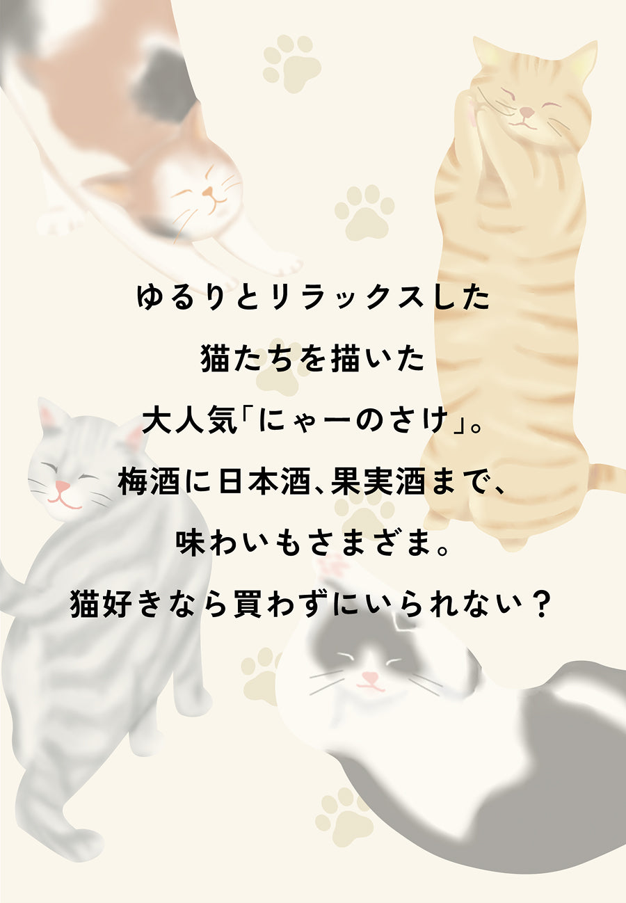 世の「ねこ好き」の方々のために生まれた「にゃーのさけ」。中には完熟南高梅を贅沢に使用した、とろとろリッチな梅酒が入っています。専用のオリジナルボックスに入れてお届け。自分用にもプレゼントにもおすすめです。