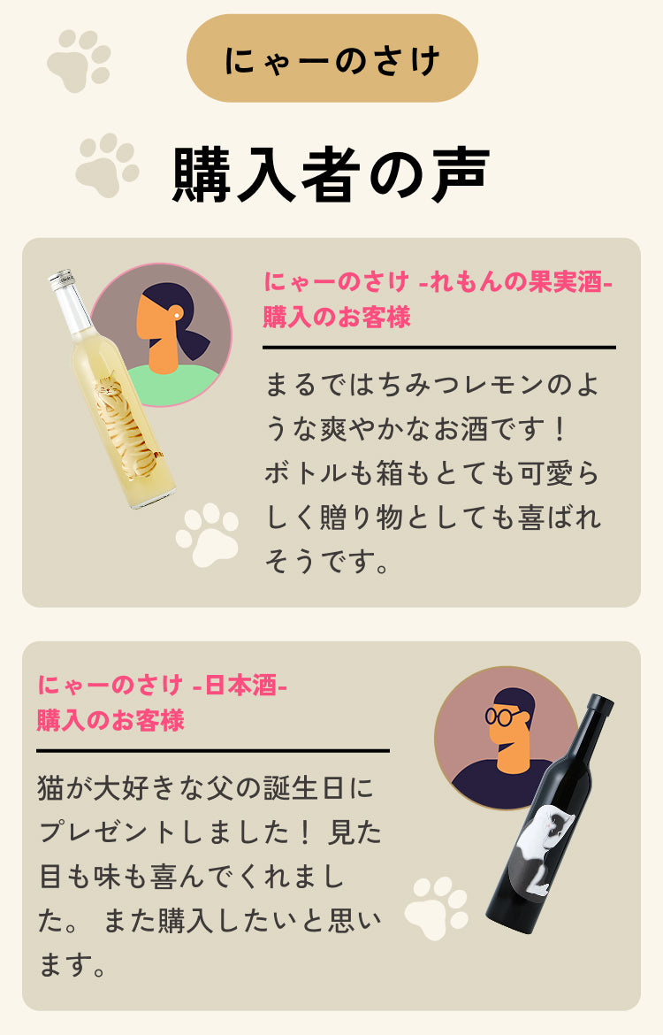 世の「ねこ好き」の方々のために生まれた「にゃーのさけ」。中にはレモンとハチミツが見事に調和した、心を癒やす果実酒が入っています。専用のオリジナルボックスに入れてお届け。自分用にもプレゼントにもおすすめです。