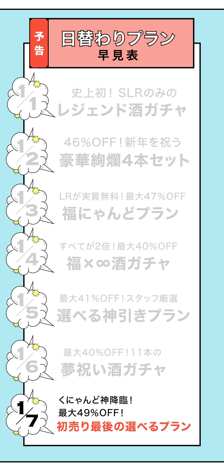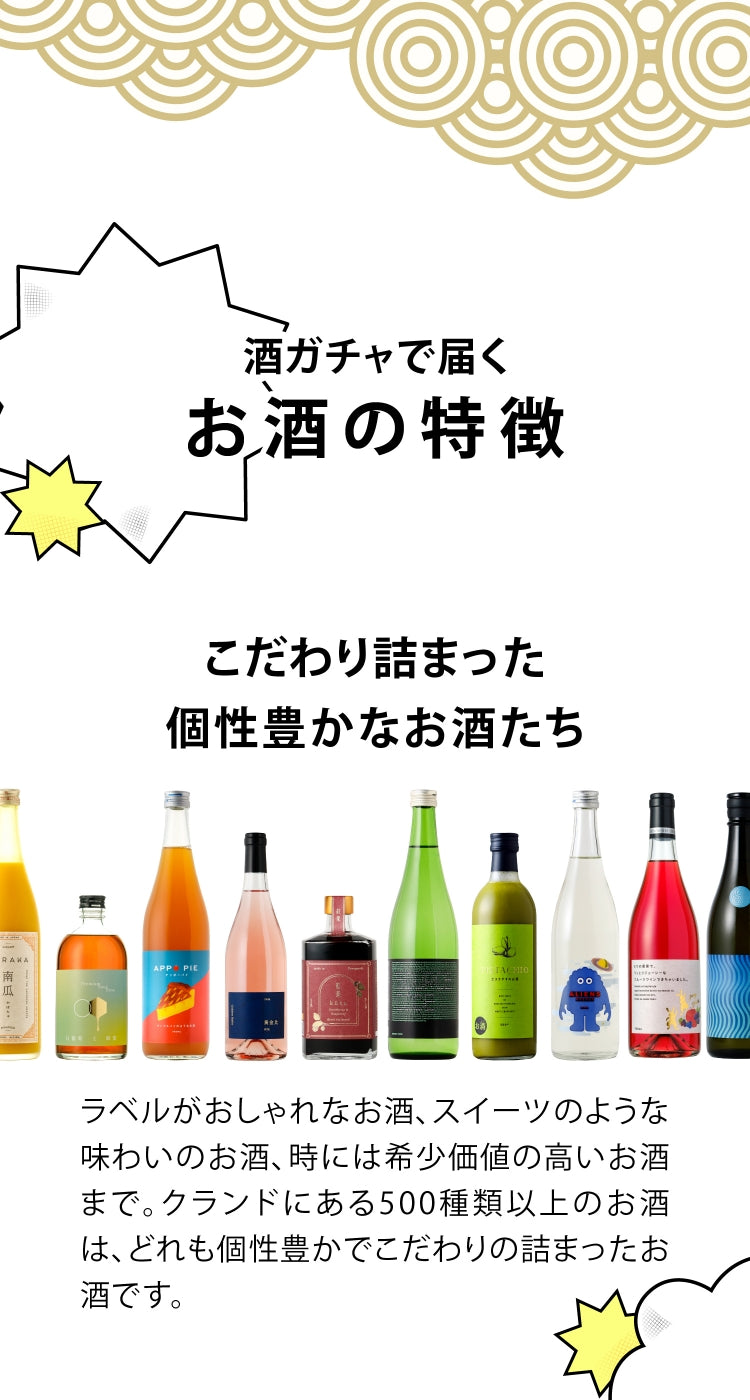 酒ガチャは「定価より、商品が最大〇%お得に購入できる」という仕組みのため、ご購入金額は変わりません。※割引率はお届けした商品により変わります。※LR(高単価商品)などが当たった場合、最大割引率を超えてお届けする場合もございます。
