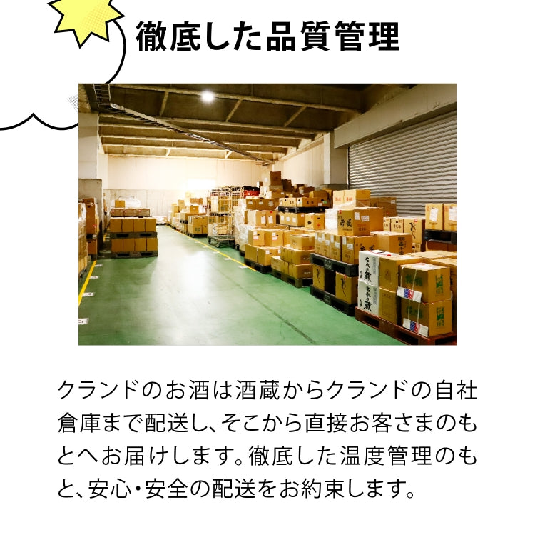 要冷蔵商品(ラベルに「要冷蔵」の記載がある商品)は、必ず冷蔵庫で保管をお願いします。それ以外の商品は、冷暗所での保管が可能です。※開封後のお酒は、風味の劣化防止のため冷蔵庫での保管をお願いいたします。