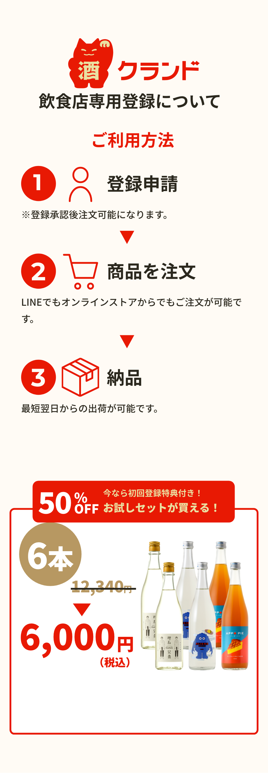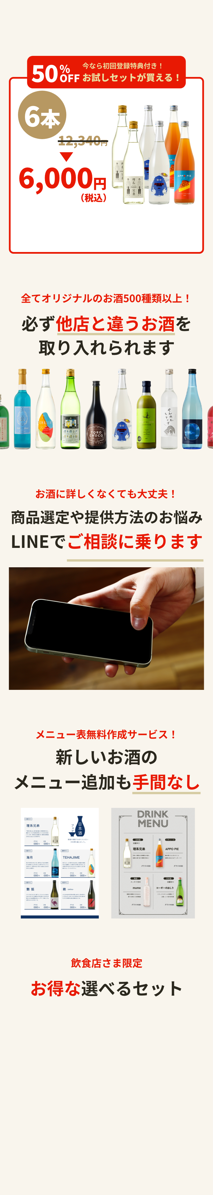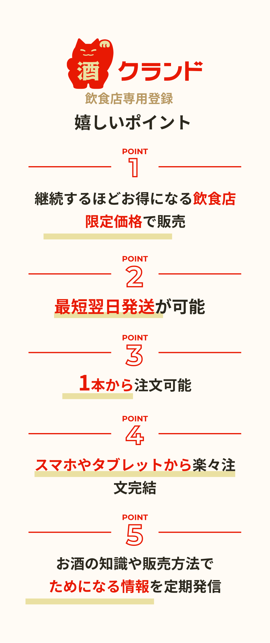 前職ではホテルやレストランのドリンクメニューのプロデュースなどもしていた経験もあるので、お客さまのご要望に合わせて、お酒のご提案をさせていただきます。例えばご希望の予算や結婚パーティなどのシーン、また季節の特集に合わせたご提案なども可能です。クランドの商品についても広く知っているので、ぜひ飲食店の皆さまの力になりたいと思っています!LINE等を通して、ぜひお気軽にご相談ください。