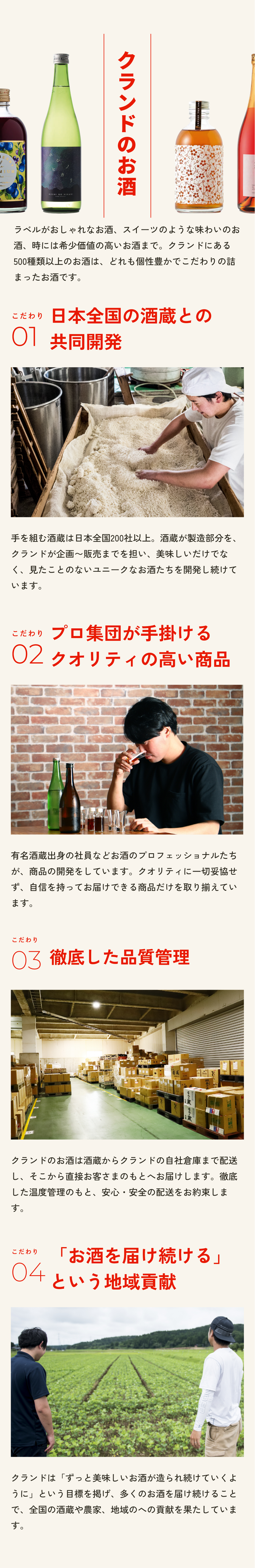 クランドでは有名酒蔵出身の社員など、お酒に関係するプロフェッショナルが、日本全国の酒蔵と手を取り合い、これまでにないアイデアとチャレンジ精神を原動力に、酒蔵のポテンシャルを発揮し新たな価値を創造していきます。