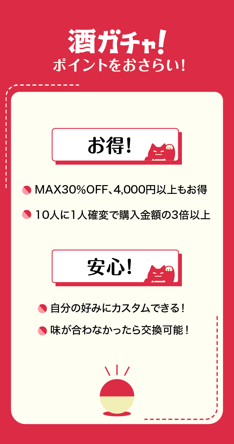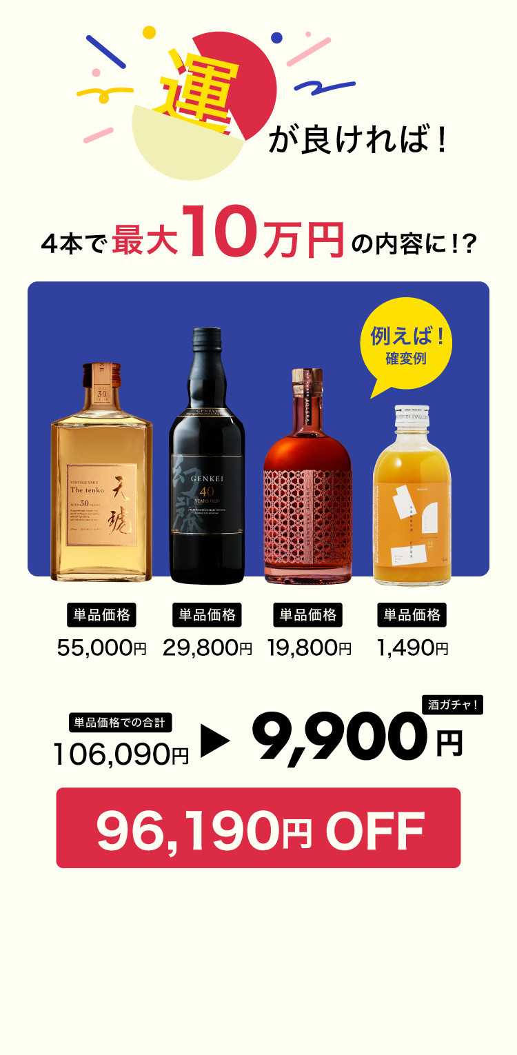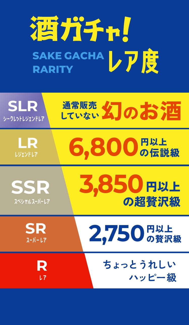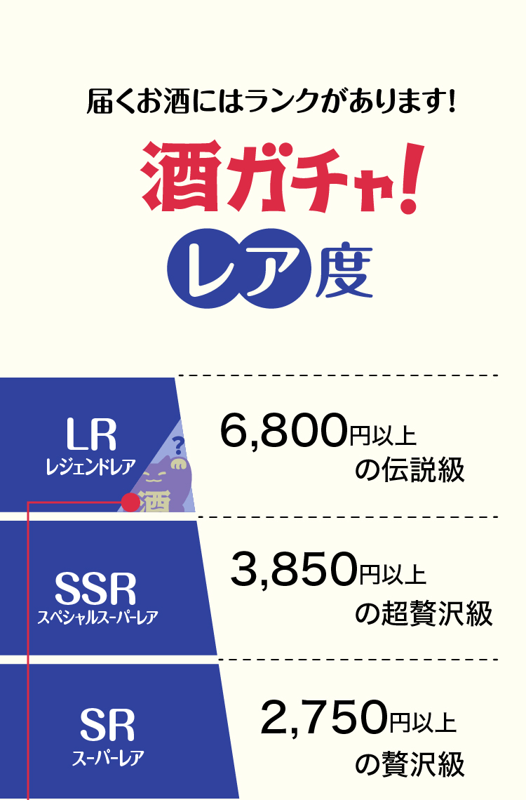 酒ガチャは「定価より、商品が最大〇%お得に購入できる」という仕組みのため、ご購入金額は変わりません。※割引率はお届けした商品により変わります。※LR(高単価商品)などが当たった場合、最大割引率を超えてお届けする場合もございます。