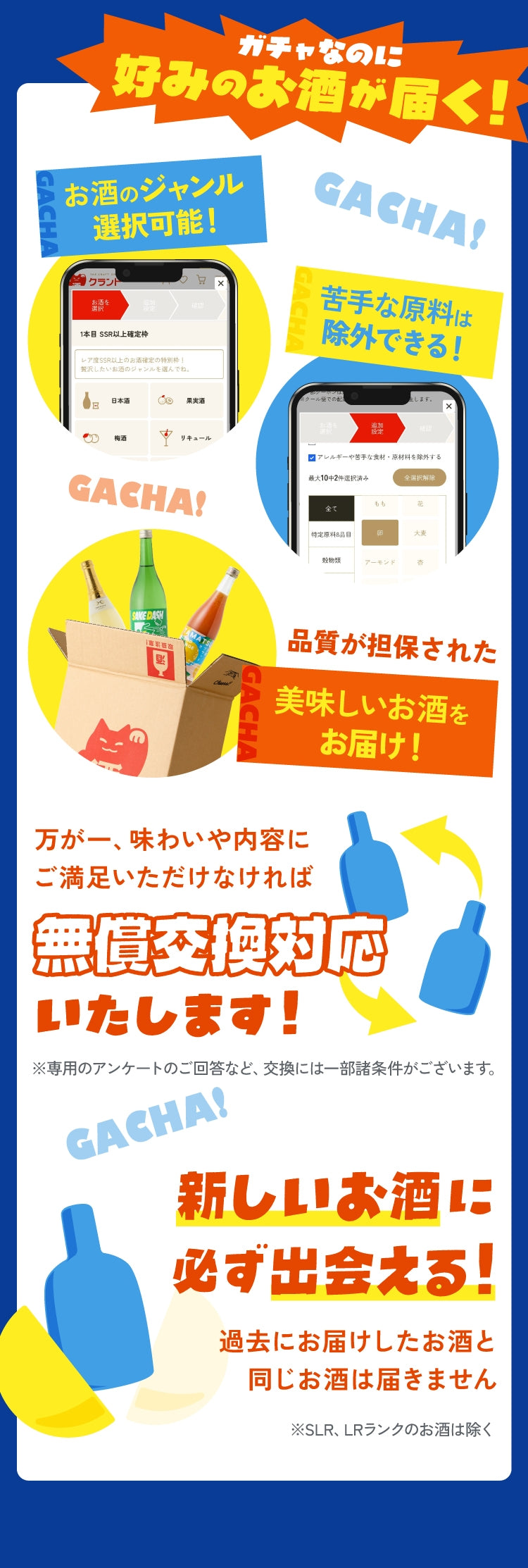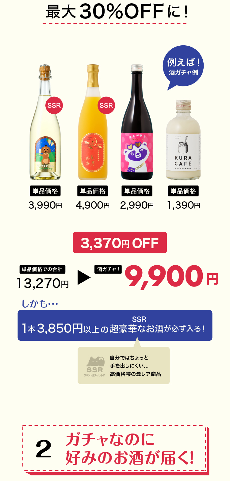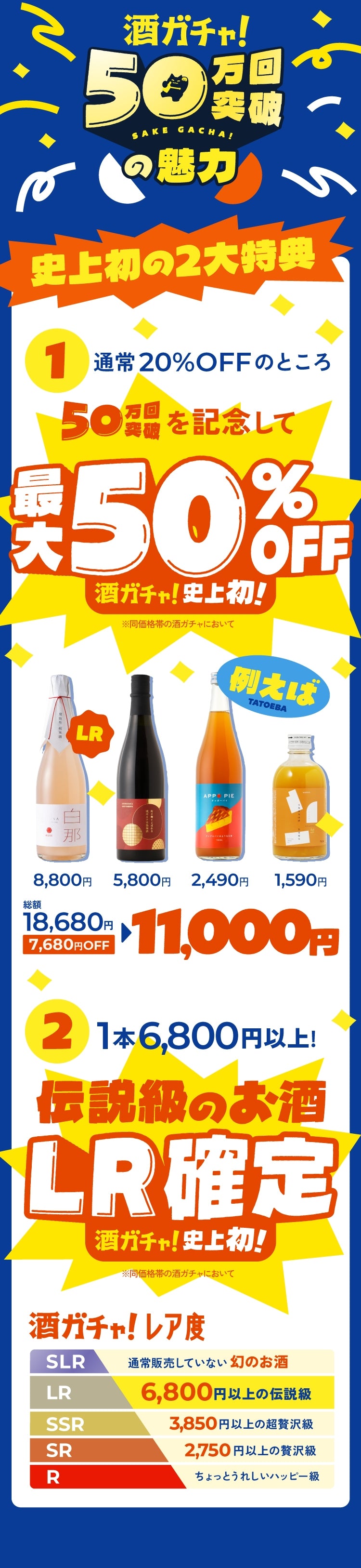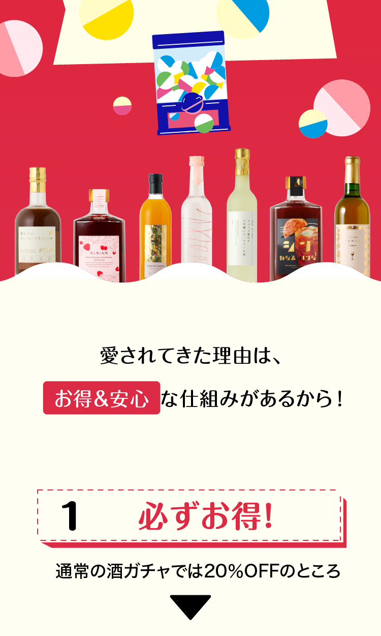酒ガチャは「定価より、商品が最大〇%お得に購入できる」という仕組みのため、ご購入金額は変わりません。※割引率はお届けした商品により変わります。※LR(高単価商品)などが当たった場合、最大割引率を超えてお届けする場合もございます。