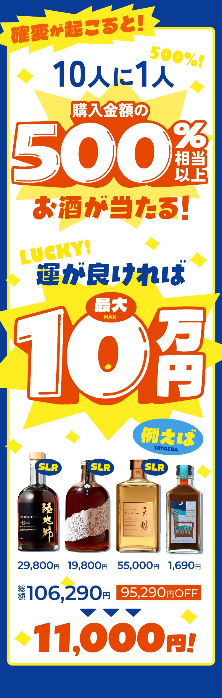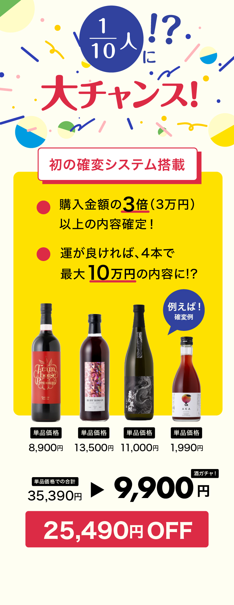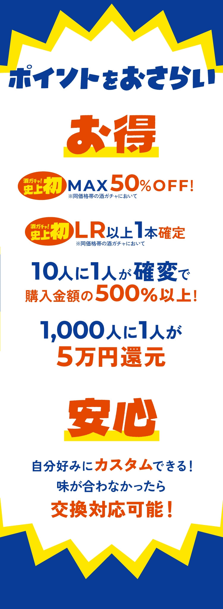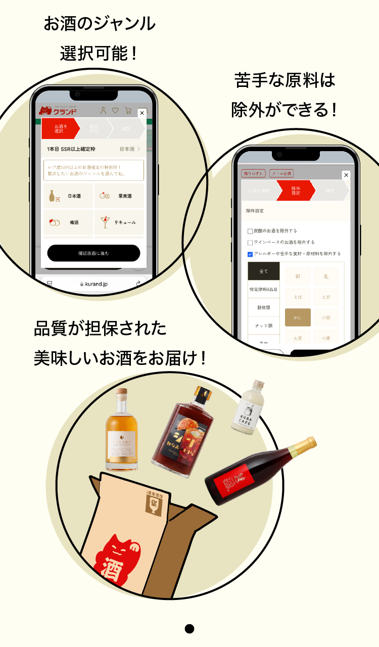 酒ガチャは「定価より、商品が最大〇%お得に購入できる」という仕組みのため、ご購入金額は変わりません。※割引率はお届けした商品により変わります。※LR(高単価商品)などが当たった場合、最大割引率を超えてお届けする場合もございます。