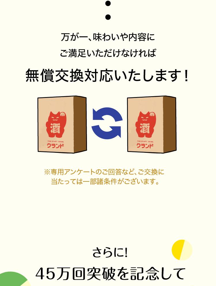 ご交換に関する送料等は弊社側で負担いたしますので、お客さま側に費用が発生することはございません。尚、以下の点だけご協力をお願いできますと幸いです。ご交換希望の商品は、7割以上残した状態でお申し付けください。ご交換の際は品質向上のためにアンケートにご回答をいただきます。そのほかご不明な点がございましたら、カスタマーサポートまでお問い合わせください。尚、ご交換の対象に選択商品や特典としてお届けする商品は含まれませんので、ご了承ください。