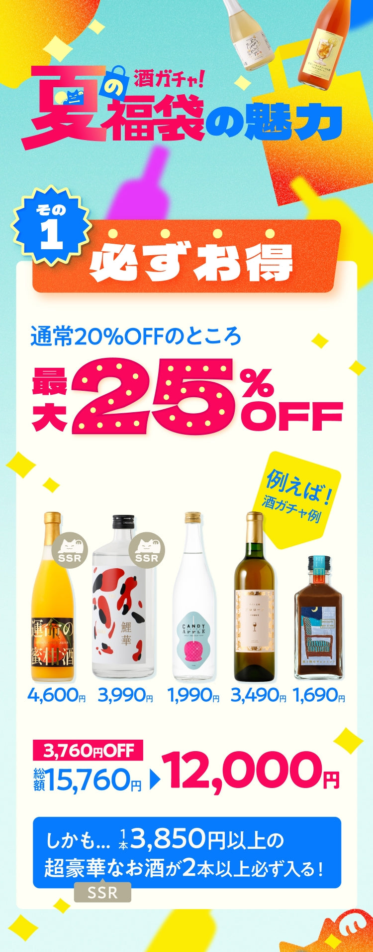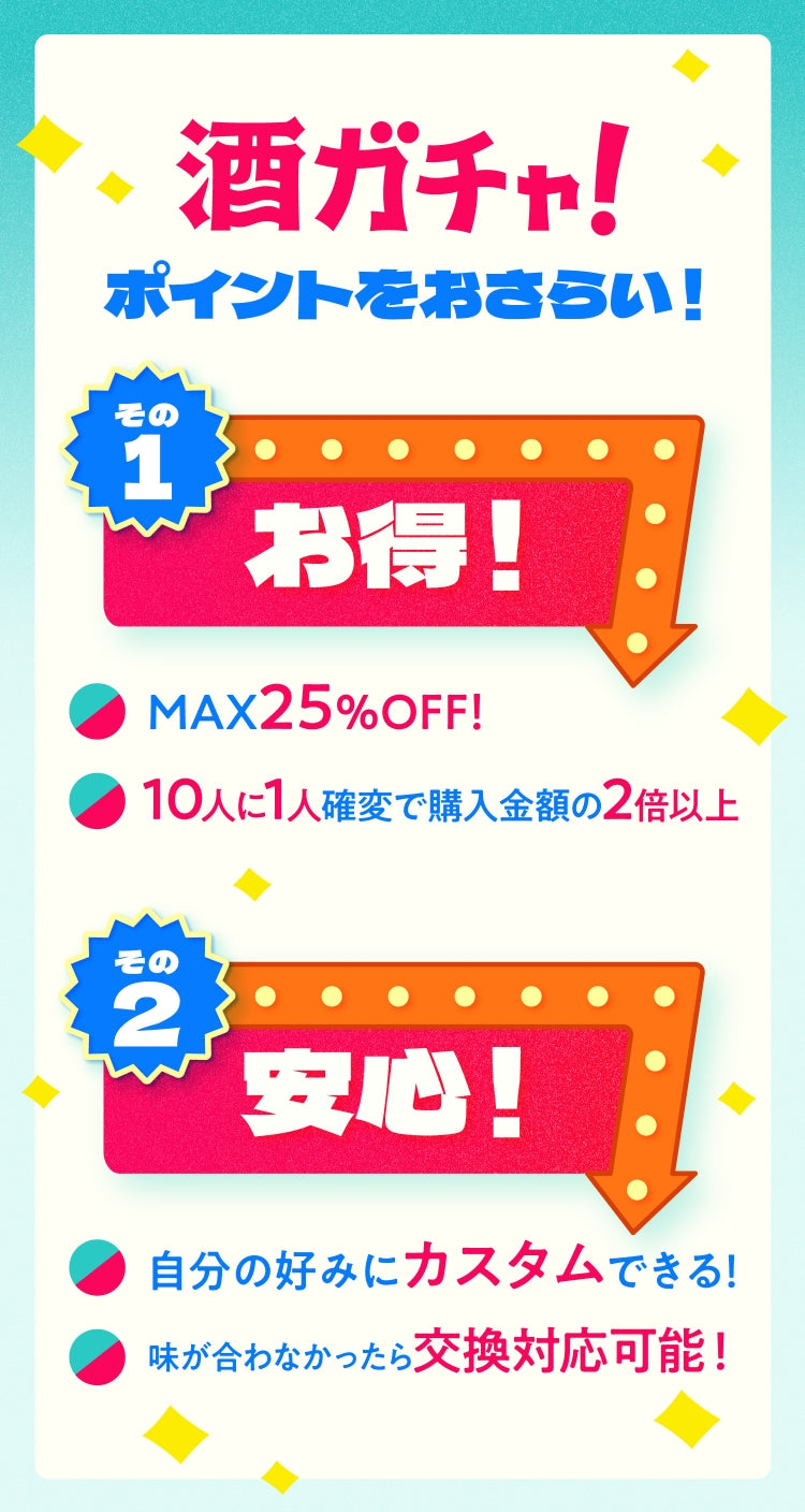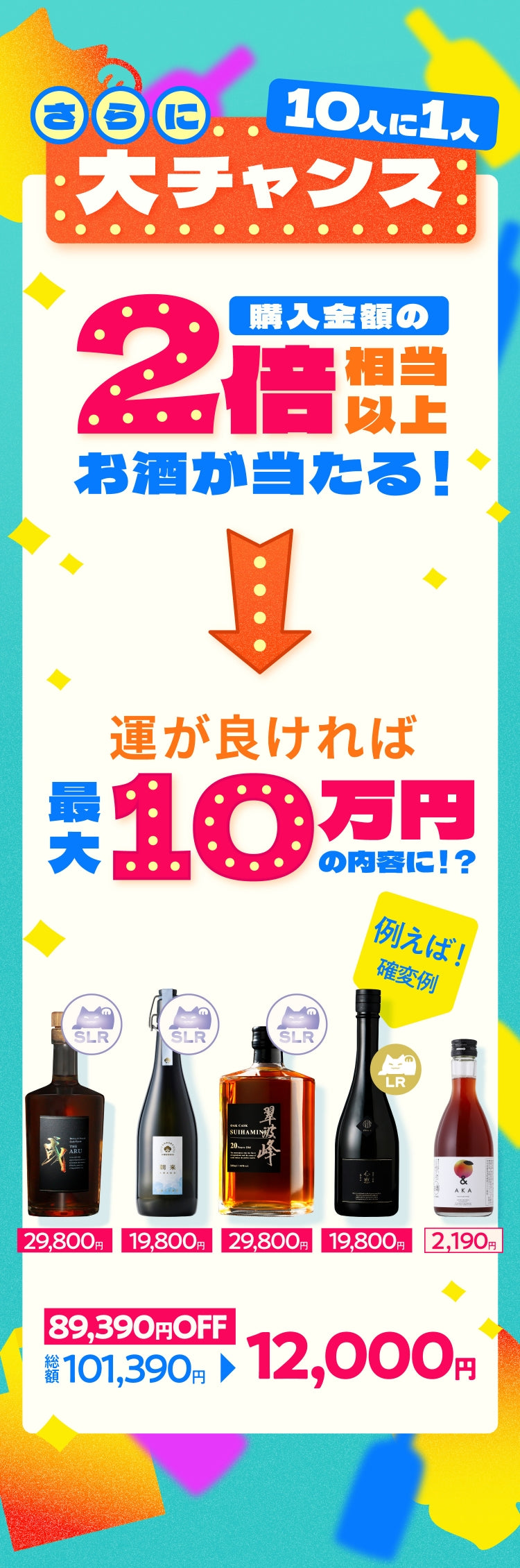 酒ガチャは「定価より、商品が最大〇%お得に購入できる」という仕組みのため、ご購入金額は変わりません。※割引率はお届けした商品により変わります。※LR(高単価商品)などが当たった場合、最大割引率を超えてお届けする場合もございます。