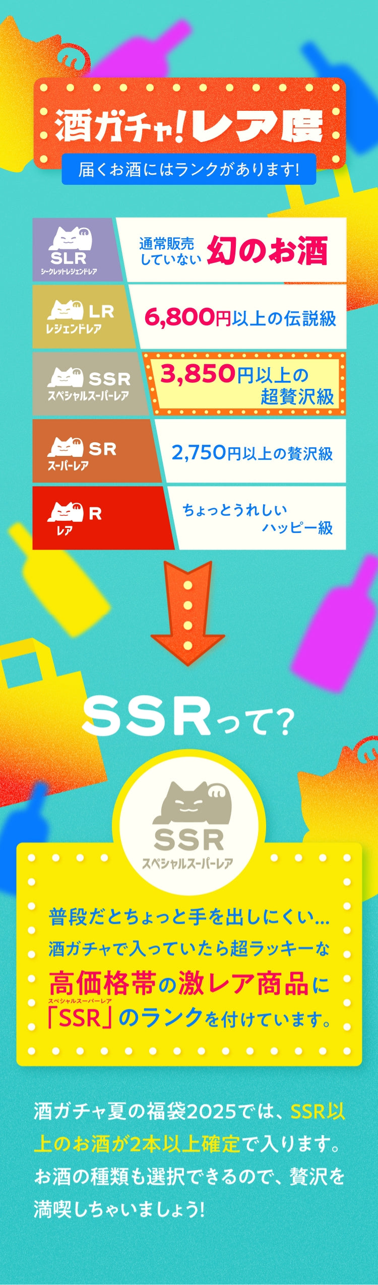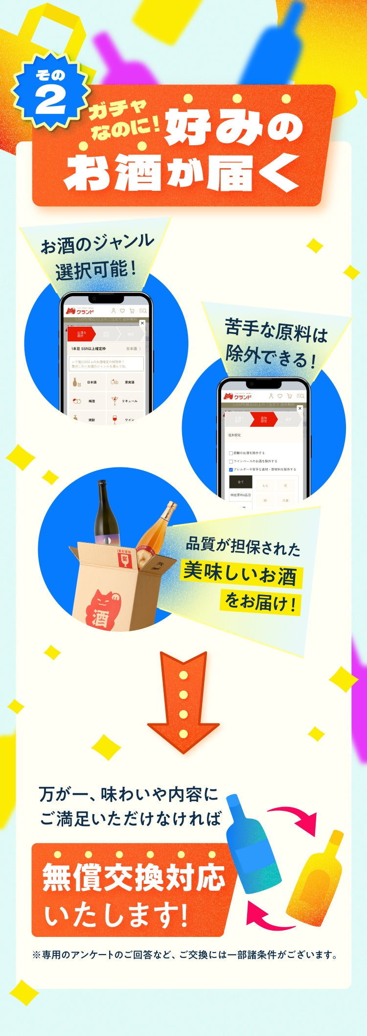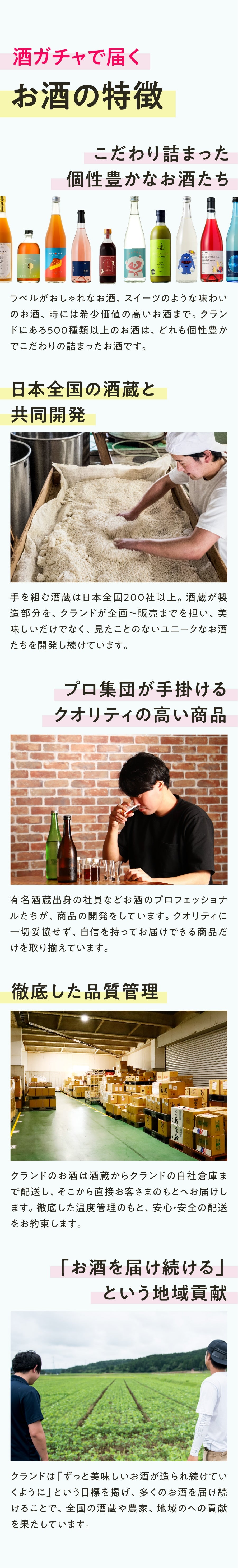 酒ガチャは「定価より、商品が最大〇%お得に購入できる」という仕組みのため、ご購入金額は変わりません。※割引率はお届けした商品により変わります。※LR(高単価商品)などが当たった場合、最大割引率を超えてお届けする場合もございます。