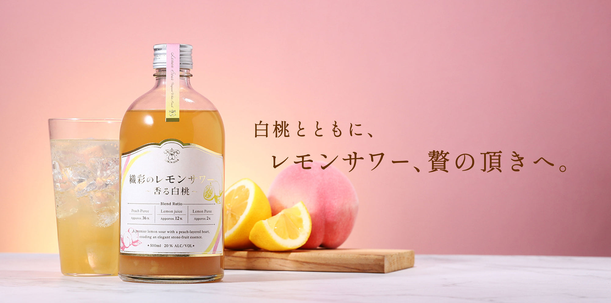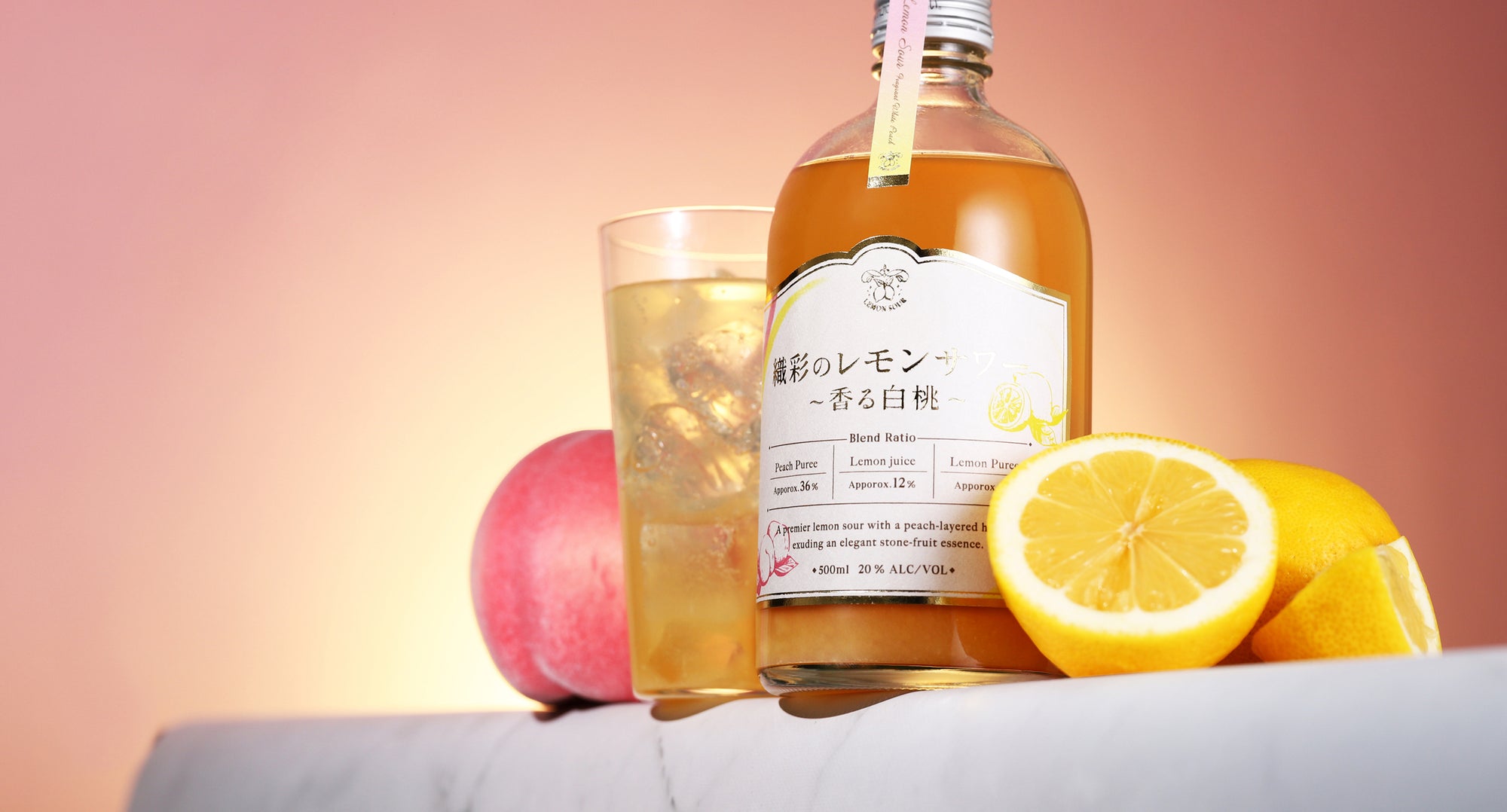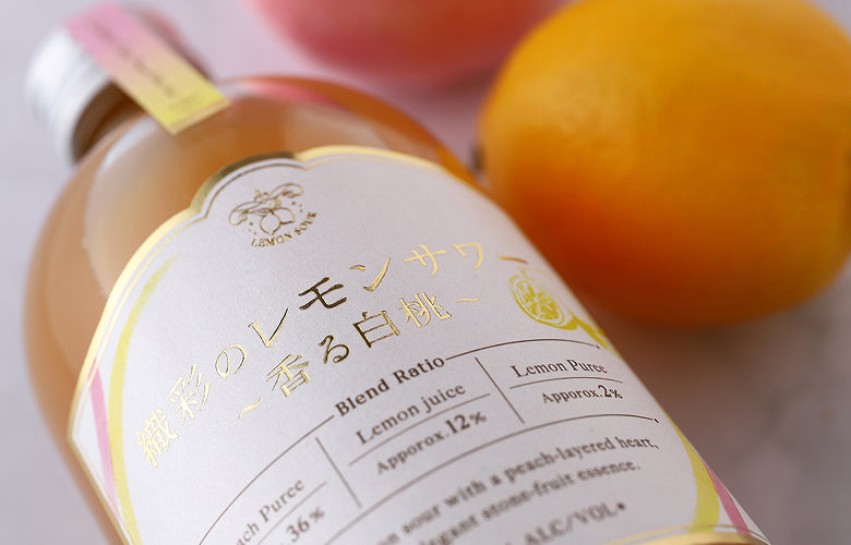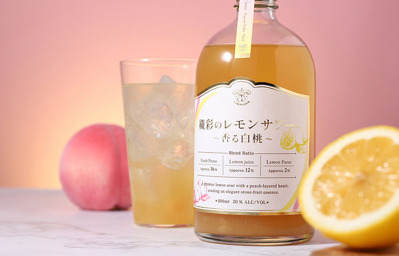 レモンの清々しさと白桃の芳醇な香りが舞ったあと、静かに現れるのがブランデーの存在感。隠し味としてほんの少量加えられたこのひとさじが、桃の柔らかな輪郭を引き締め、飲み終えたあとまで香りを優雅にまとめあげます。「織彩のレモンサワー ~香る白桃~」は、炭酸水と1:3で割ってお楽しみください。炭酸で割るとレモンの清涼感が立ち上がり、白桃の濃厚な香りが軽やかに舞います。日常を特別に彩る1本です。