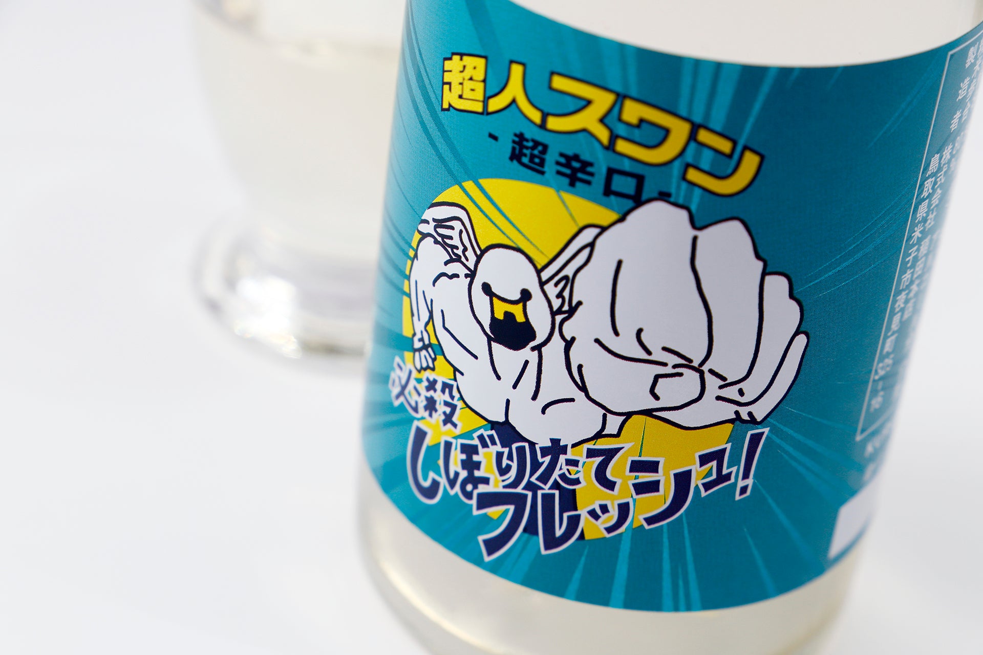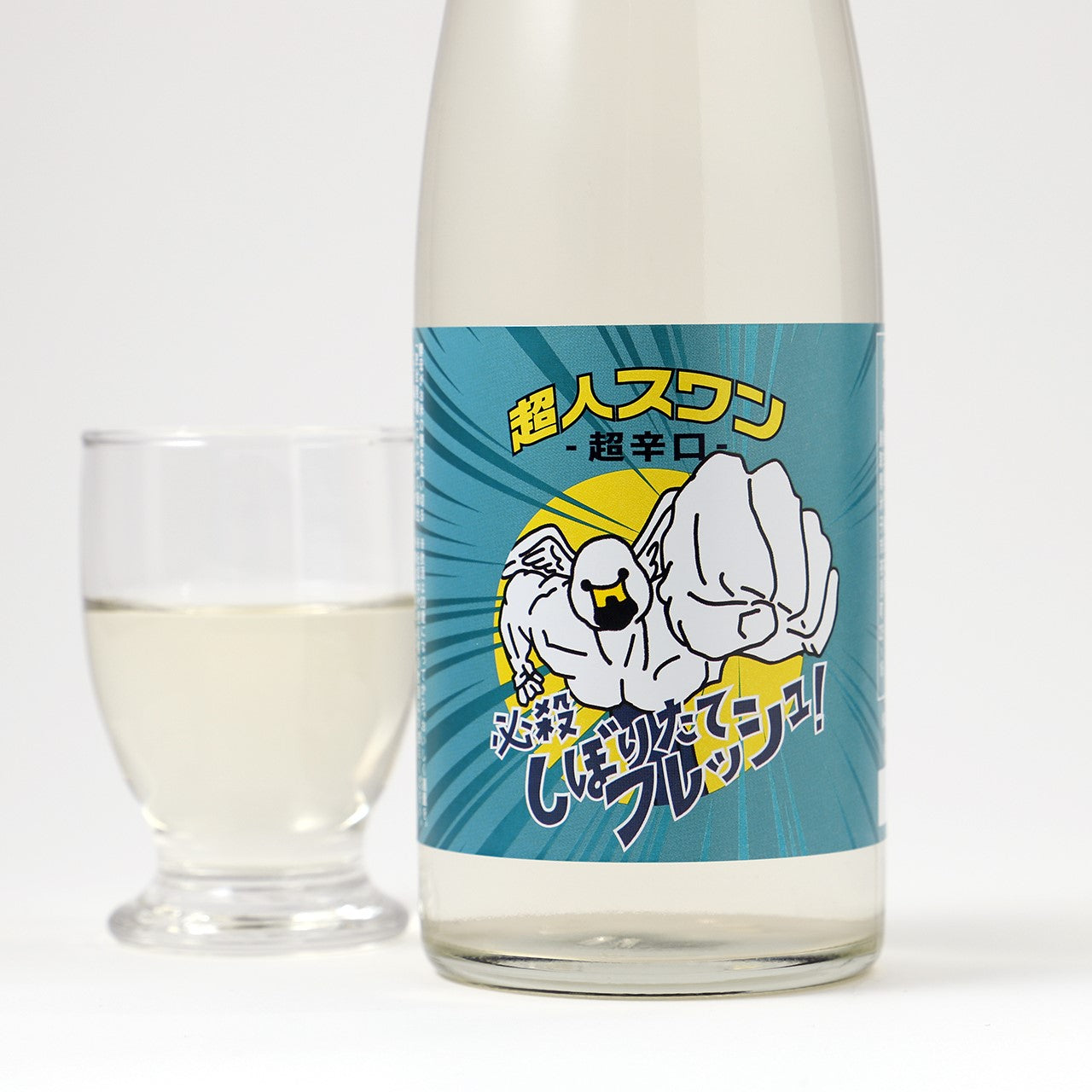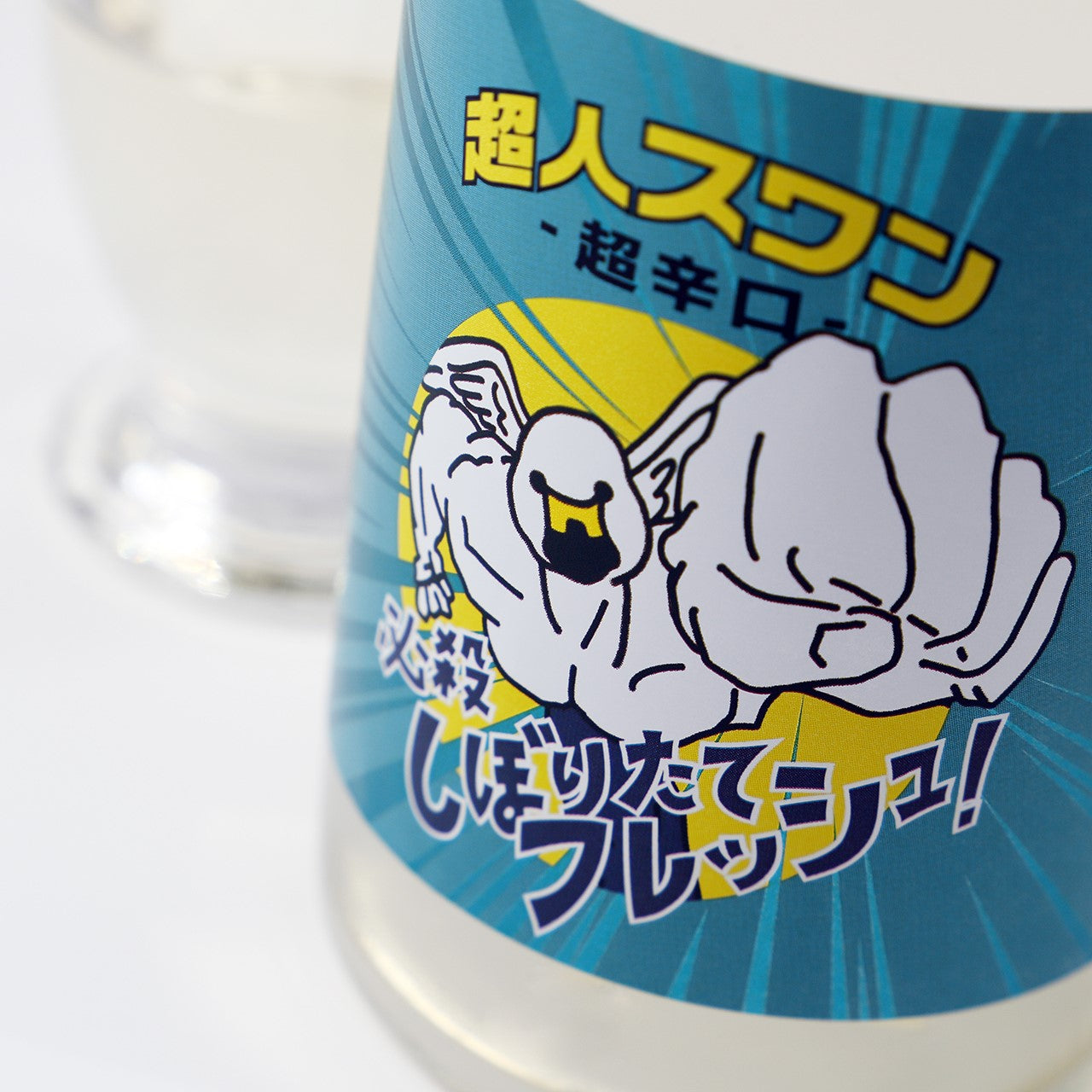 麹菌がつくる酵素でお米を糖に分解し、酵母が糖をアルコールに分解する、並行複発酵により造られる日本酒。中でも、酵母が高いアルコール濃度の状態でもろみの糖分を使い尽くすことで自然に発酵が止まることを完全発酵といいます。完全発酵のタイミングを見極める造り手の技術をもって、キレッキレの超辛口な完全発酵日本酒「超人スワン」が誕生。フレッシュなデザインとなった今だけの「必殺しぼりたてフレッシュ」の味わい、ご堪能あれ。