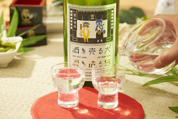 SNSでも話題になった「大切な友と呑み交わす酒」がコンセプトの日本酒です。宝山酒造の次期蔵元杜氏・渡邉氏と営業の若松氏は、大学の同級生。そんな2人を猫と犬に見立てたキャラクターをラベルに描きました。