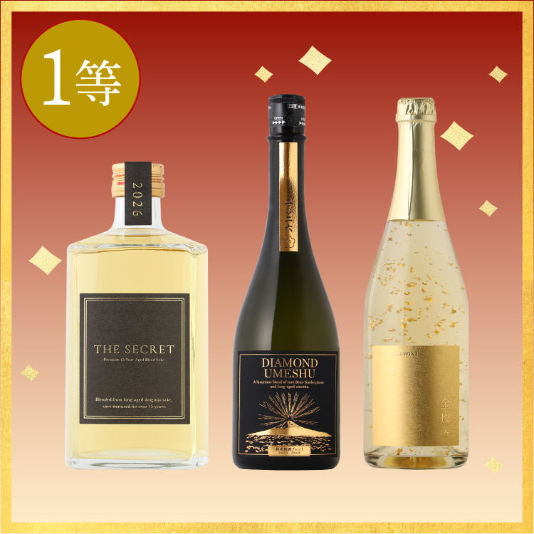 ②1等は、LR(レジェンドレア)ランクの福袋商品「DIAMOND UMESHU」「金燦々 -kinsansan-」「THE SECRET -Premium 15 Year Aged Blend Sake-」3本の合計45,700円のセット