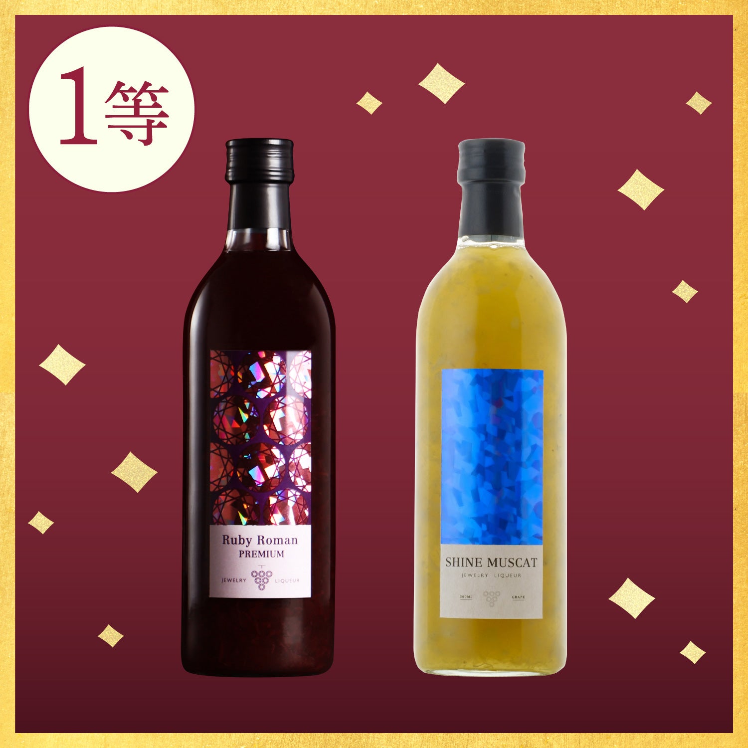 ②1等は、ブランド果実を使った贅沢リキュール「Ruby Roman PREMIUM」「Shine Muscat」の2本、合計25,800円のセット