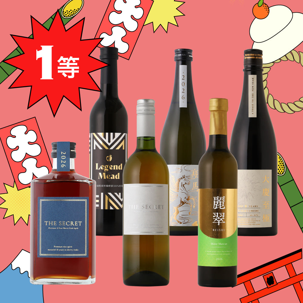 ②1等は、LR(レジェンドレア)ランクの福袋商品「THE SECRET -Premium 1996 Vintage Koshu-」(ワイン)、「Shine Muscat -麗翠-」(果実酒)、「THE SECRET -Premium 16 Year Sherry 」Cask Aged-」(焼酎)」、「翔馬」(日本酒)、「大慶至極」(梅酒)、「Legend Mead」(リキュール)の6本合計10万2,000円のセット。