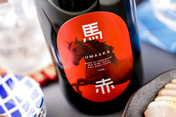 熊本弁で「うまか」は「美味しい」を意味します。この「うまか」の響きの中に、「馬肉に合う赤ワイン酵母を使用した焼酎」という意味を込めて「馬赤(うまあか)」と名付けました。馬肉と一緒に「馬赤」を飲んだ方が、ついつい「うまか」と言ってしまうようなお酒ができました。