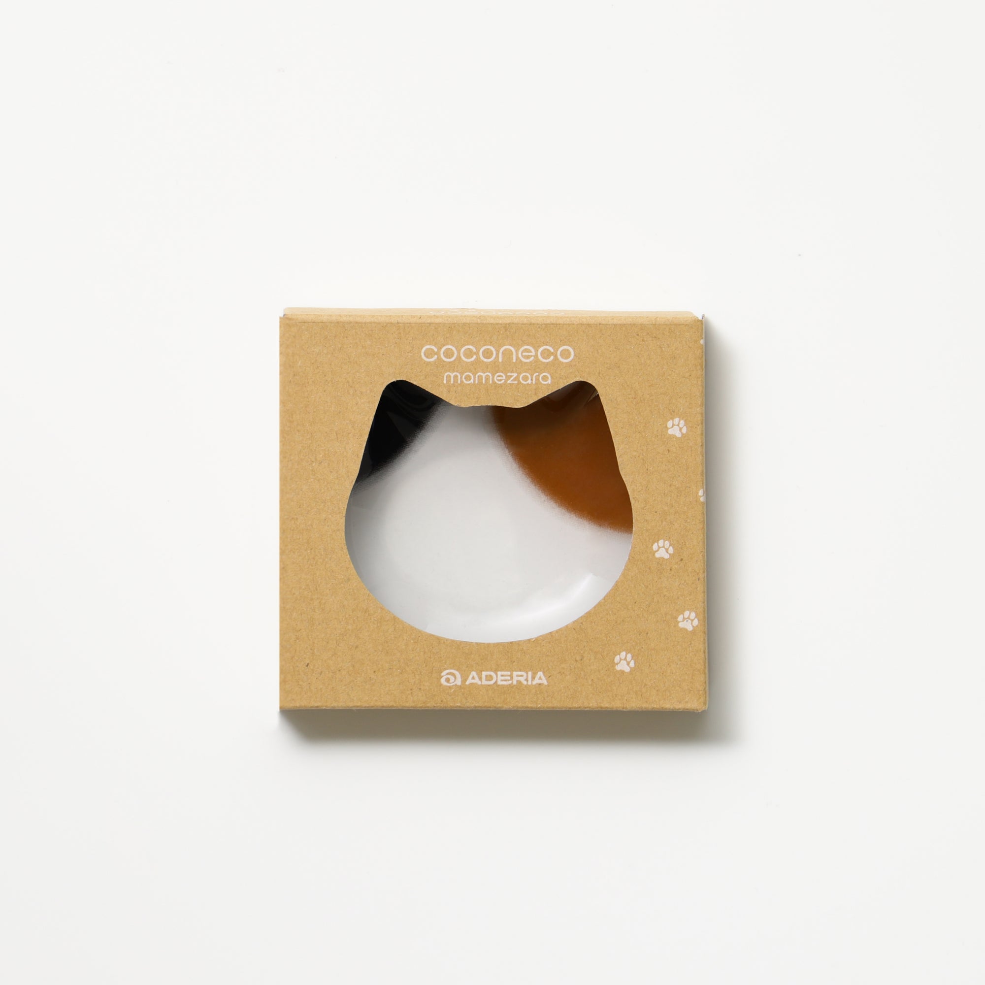 ねこちゃんの顔をモチーフにした豆皿。白地に黒と茶色の模様はまるでミケねこ。思わずほっこりしてしまう可愛さです。