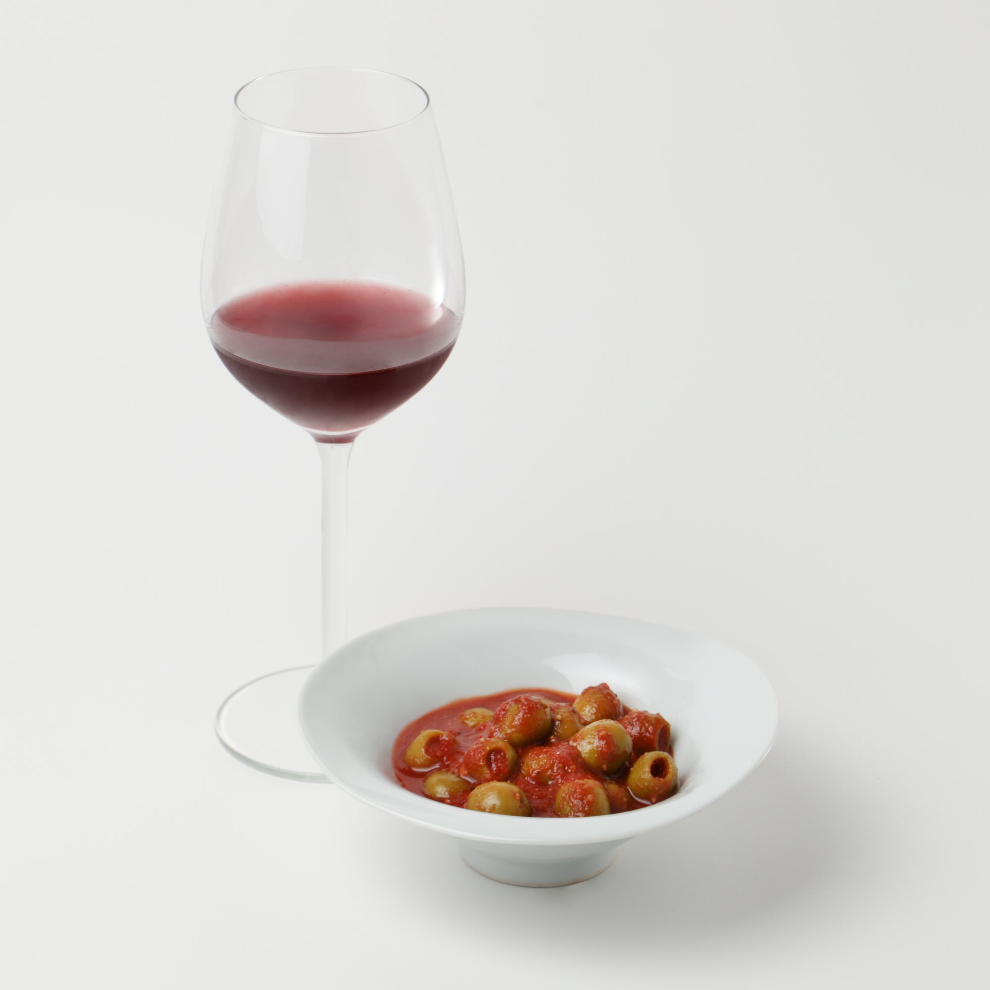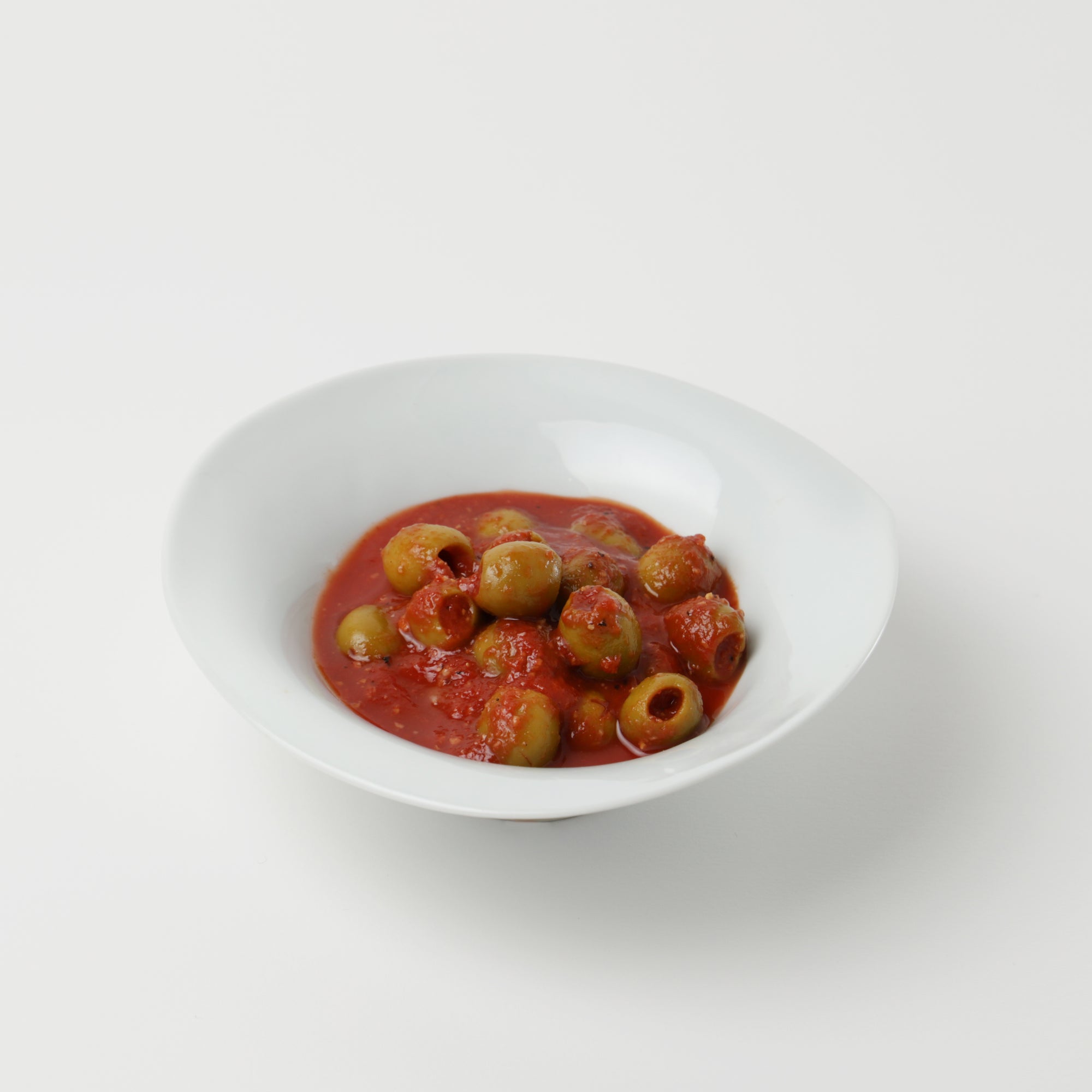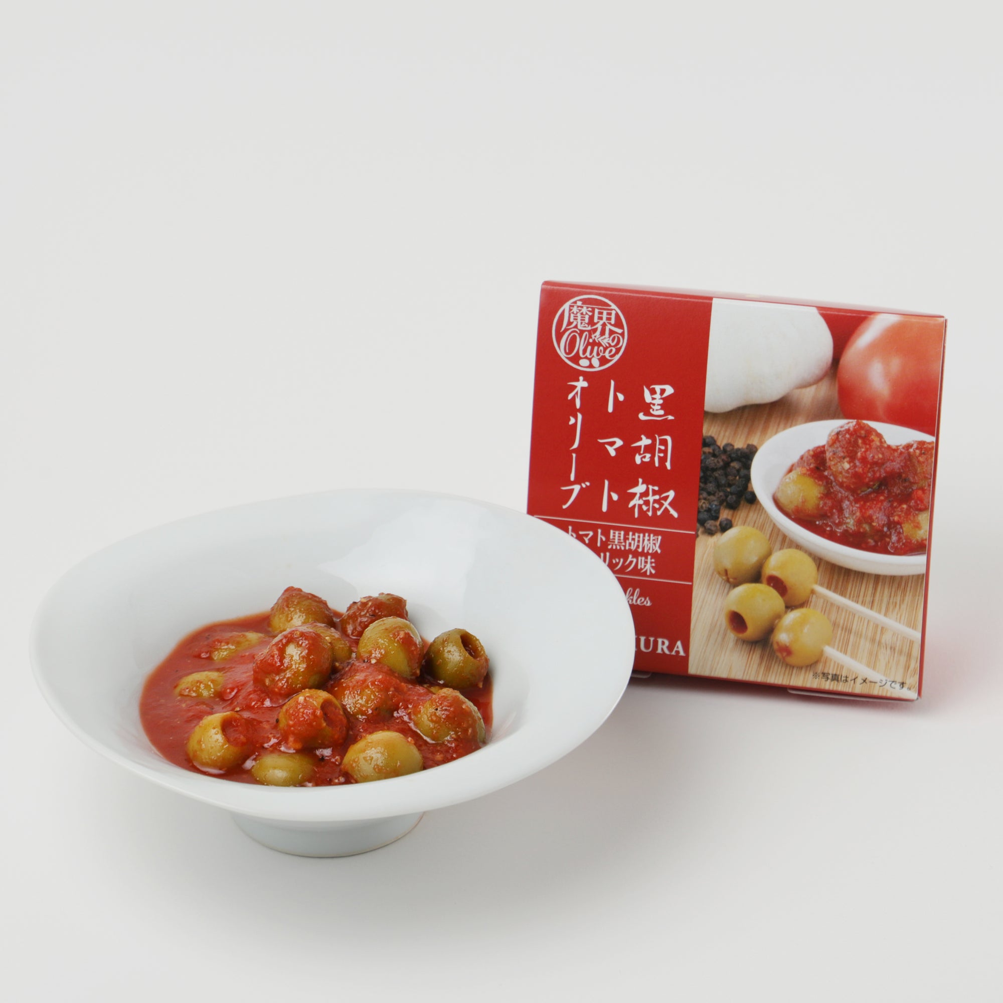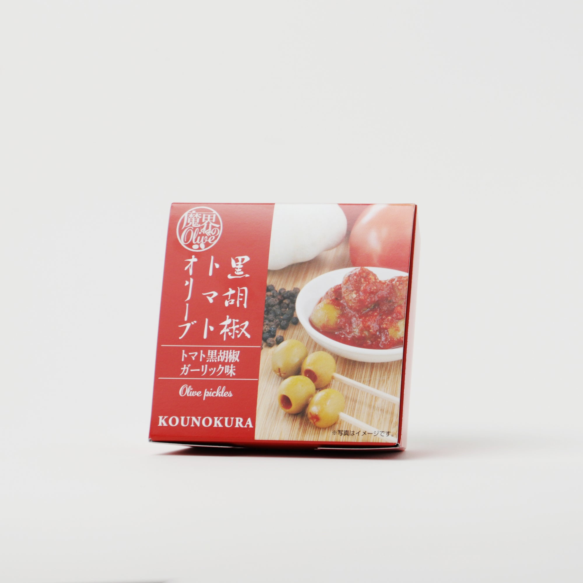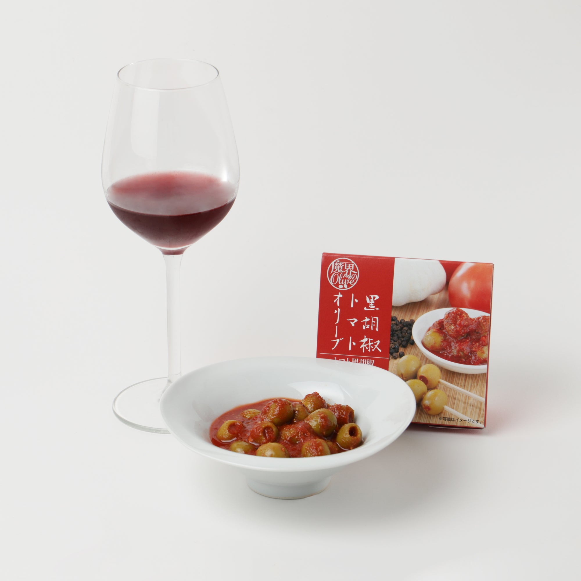 スペイン産のオリーブを、トマトペースト、ニンニク、黒胡椒に漬け込みました。オリーブを噛むと、香ばしいニンニクや黒胡椒の香りとともに、トマトの旨みが口いっぱいに広がります。