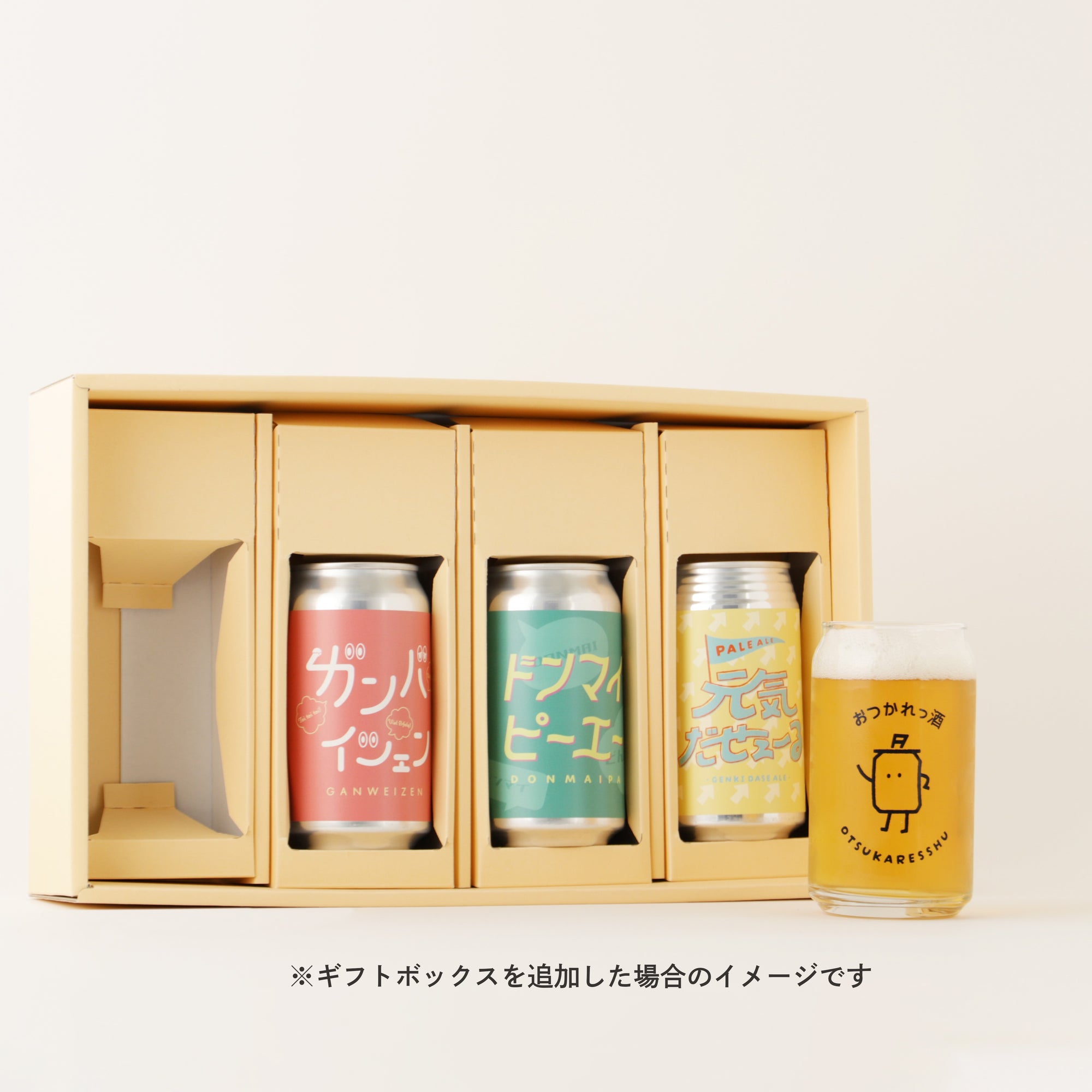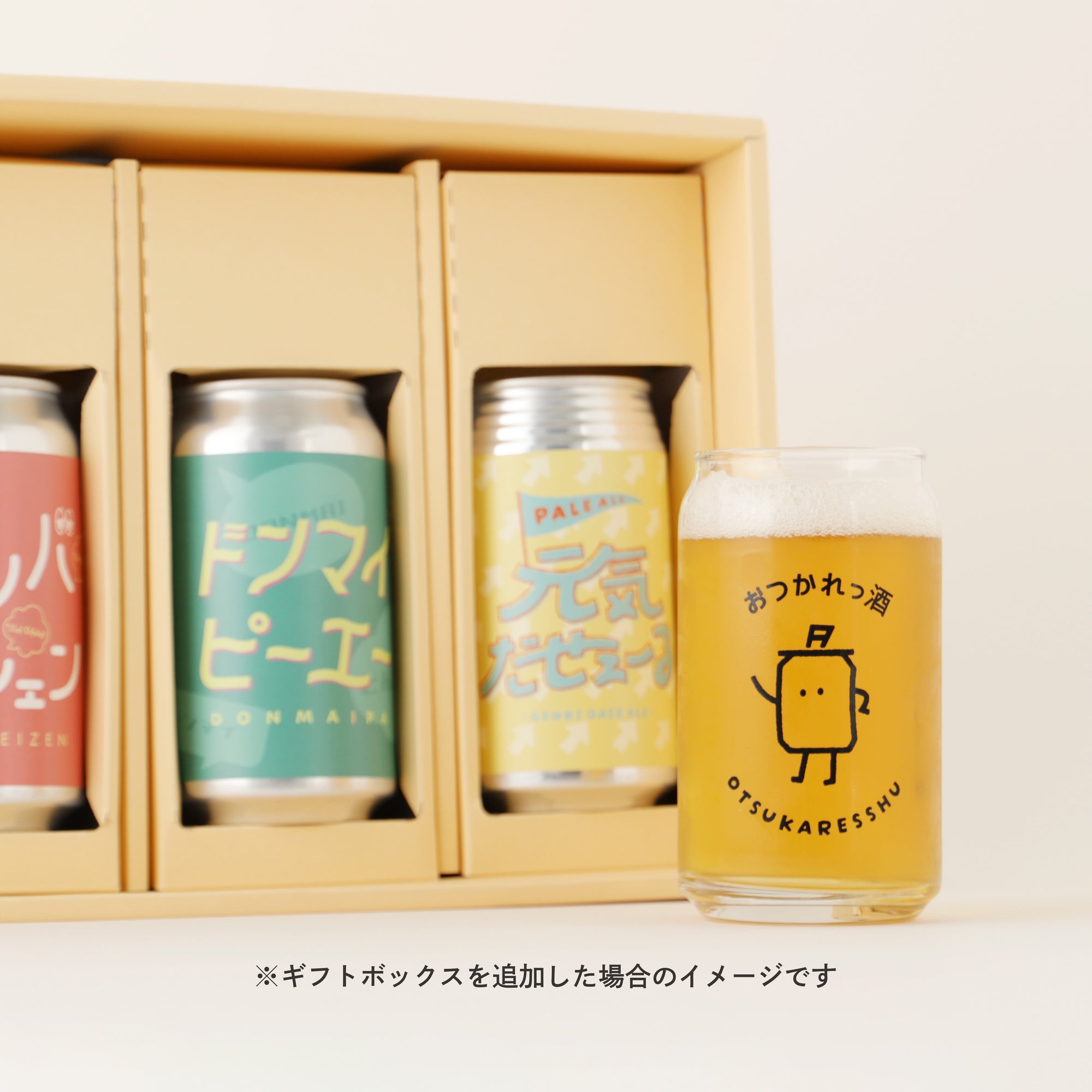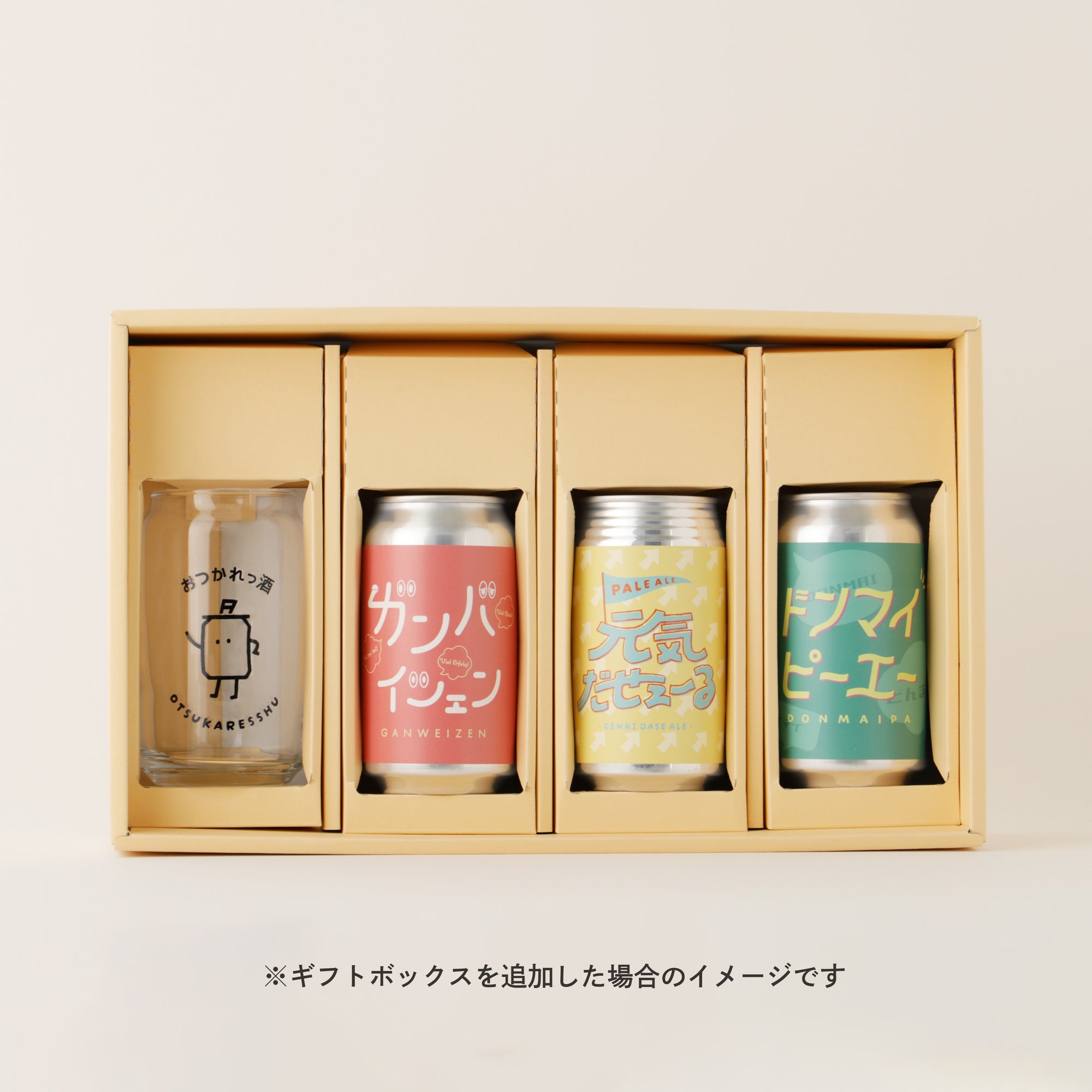 「おつかれっ酒」プロジェクトから、クラフトビール3本とオリジナルビール缶グラス1個のセットです。