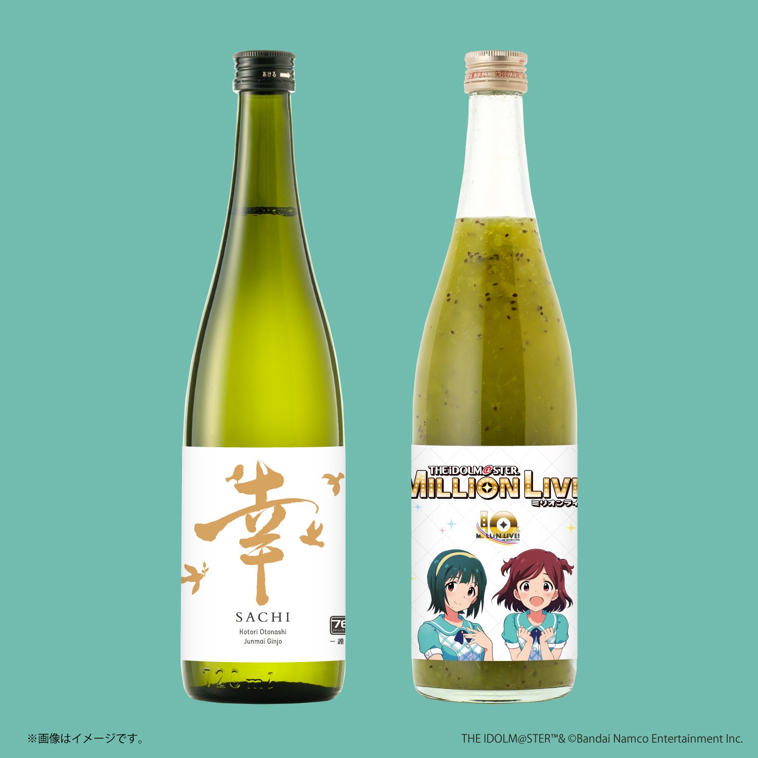 今回のコラボ酒ガチャには、10周年を記念し、いつもプロデューサーの皆さんを支えている765プロの事務員2人がモチーフのお酒が必ず入ります。『アイドルマスター ミリオンライブ!』コラボ限定オリジナルラベルのお酒「純米吟醸 - 幸 -」1本と「KANIKU KIWI - 765 Production Limited Edition -」1本、クランド選定酒2本(うち1本は新春ラベルのお酒)の合計4本が入った酒ガチャです。