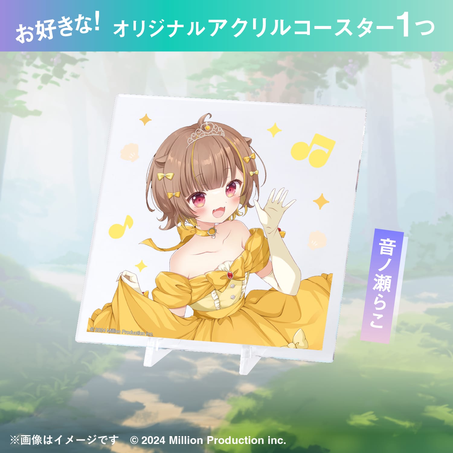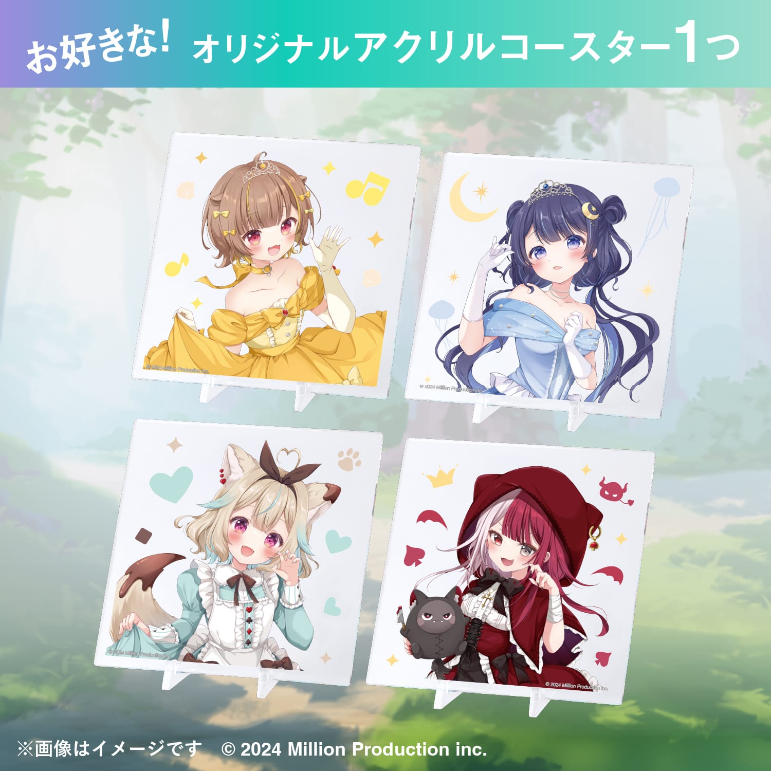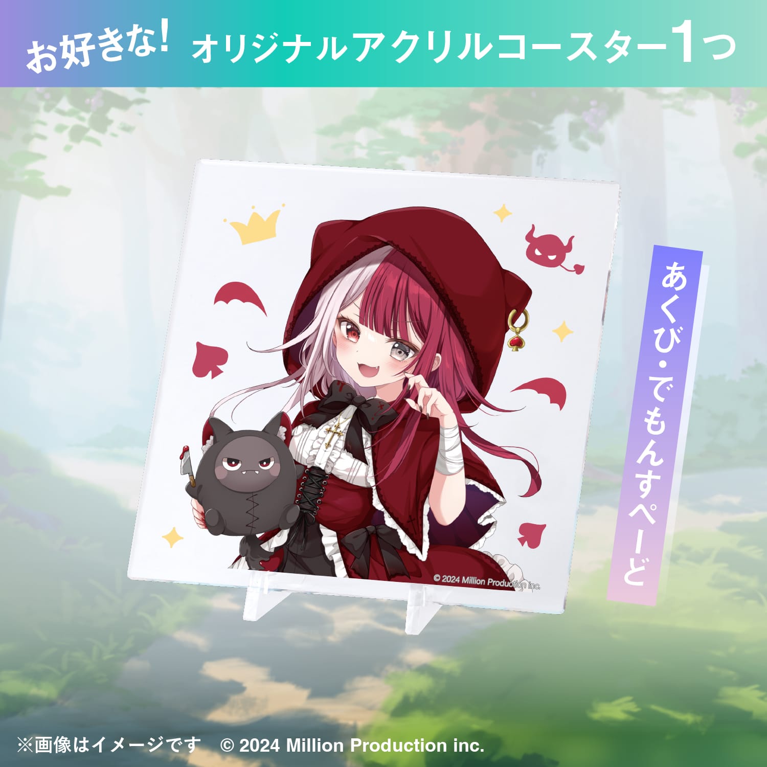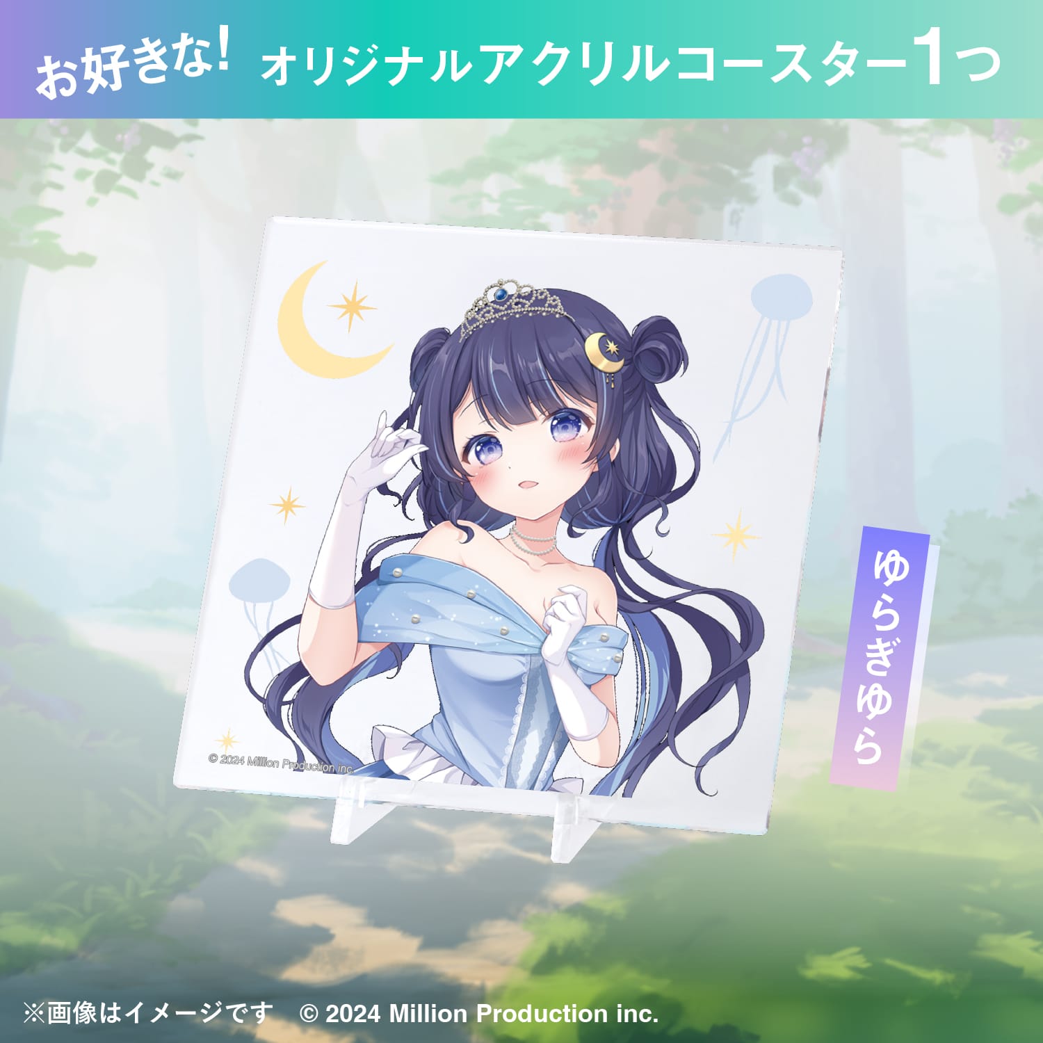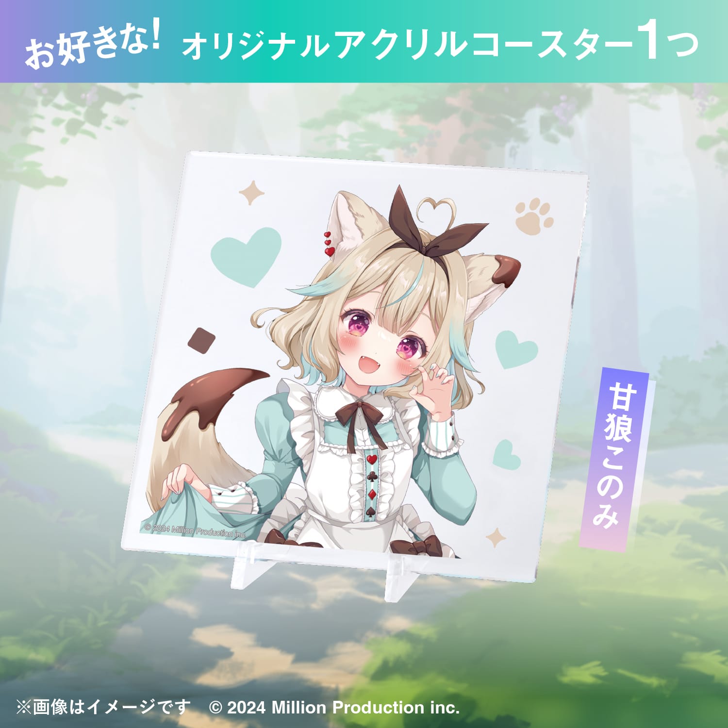 購入特典は、「描き下ろしアクリルコースター」1個。甘狼このみ、あくび・でもんすぺーど、音ノ瀬らこ、ゆらぎゆらの4人の中から、お好きなタレントのデザインをお選びいただけます。