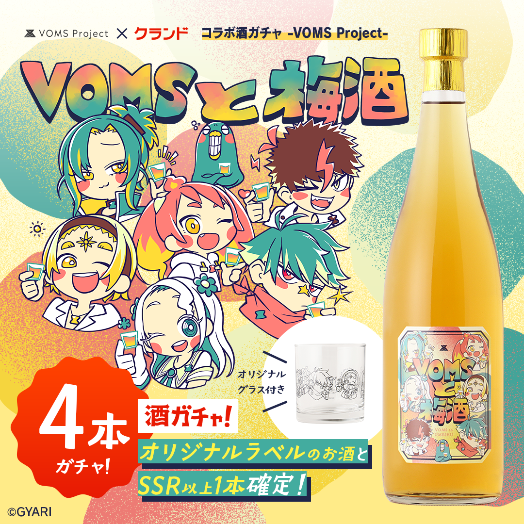 「コラボ酒ガチャ -VOMS Project-」は、VOMSメンバーとファンのための飲み会をテーマにしたコラボ酒ガチャ。「VOMS Project」オリジナルラベルのお酒「VOMSと梅酒」1本、SSR(スペシャルスーパーレア)ランク以上の商品1本、ランダムで選定される2本の合計4本が入った酒ガチャとなっています。