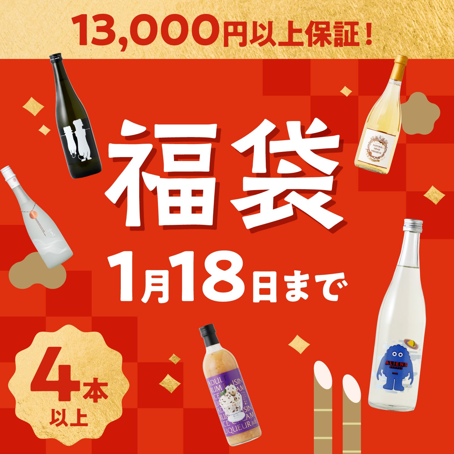 ① 必ず13,000円以上の内容のお酒が届く4本入り福袋