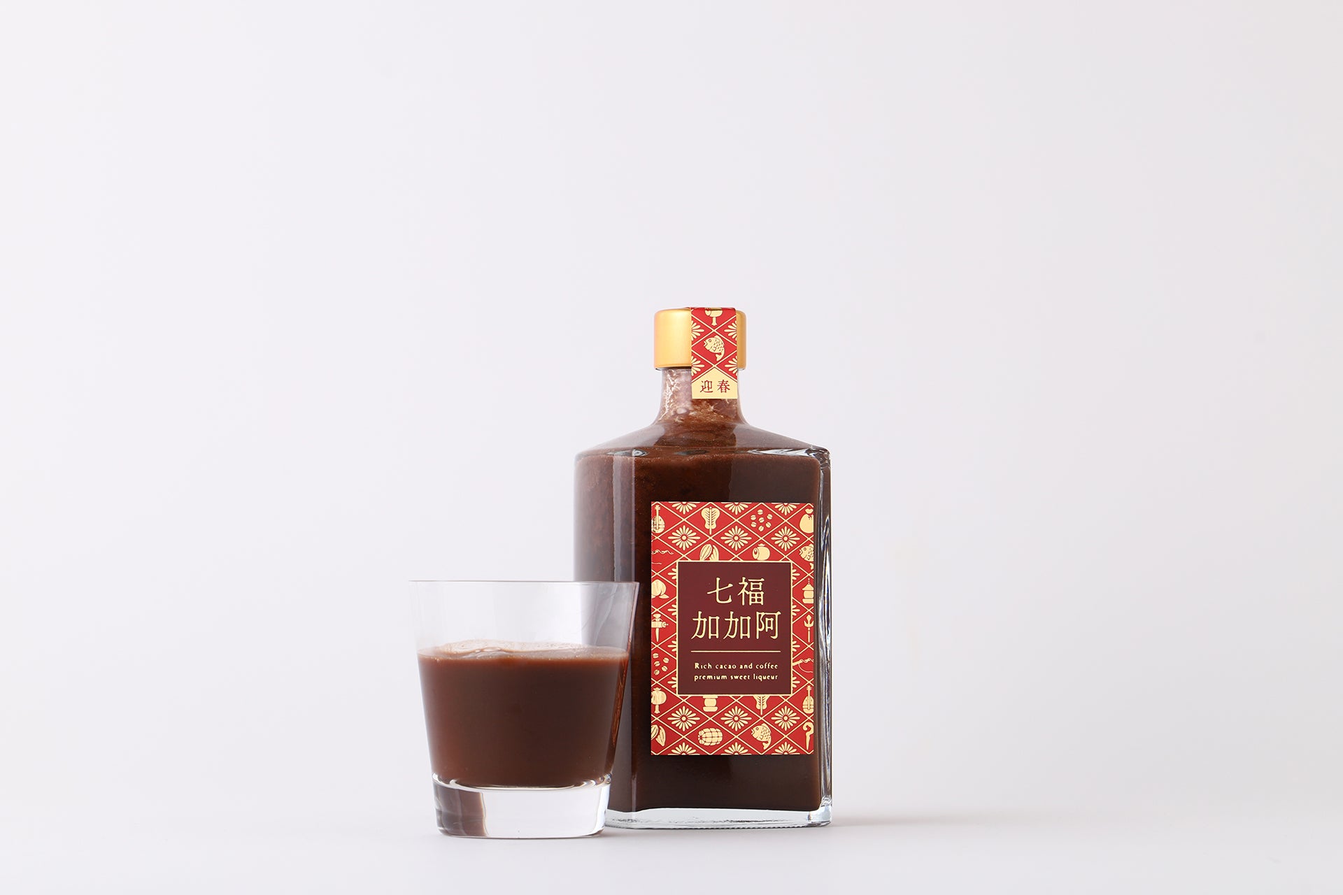 一粒のチョコを口にして、ブラックコーヒーを飲む。そんな至福の体験を再現したお酒「七福加加阿」。焙煎したてのブラジル産コーヒー豆を丁寧に抽出し、香り高いカカオパウダーと芳醇なブランデーを重ね合わせました。ひと口で幸福感が満ち渡る、至高のデザートリキュールです。
