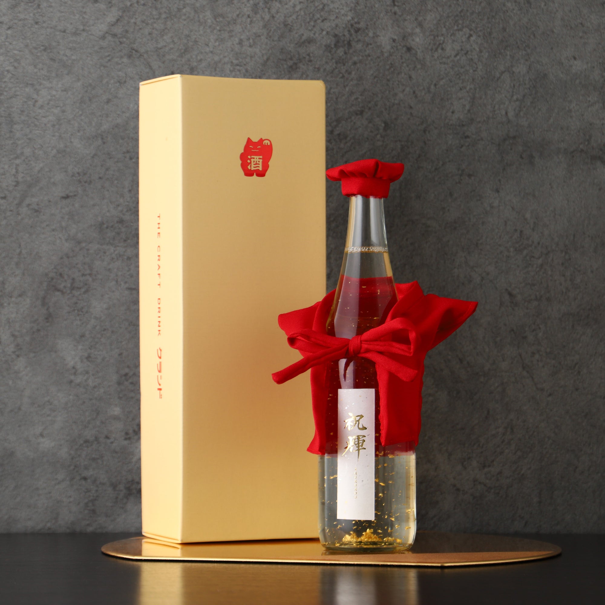 「祝輝 -Shukukou-」は、「大切な人への贈り物となる1本を」をテーマに開発した純米吟醸酒です。日本酒の中に金箔を入れることで、淡い金色に光が反射し、まるで日本酒が輝いているかのような様子を生み出しました。
