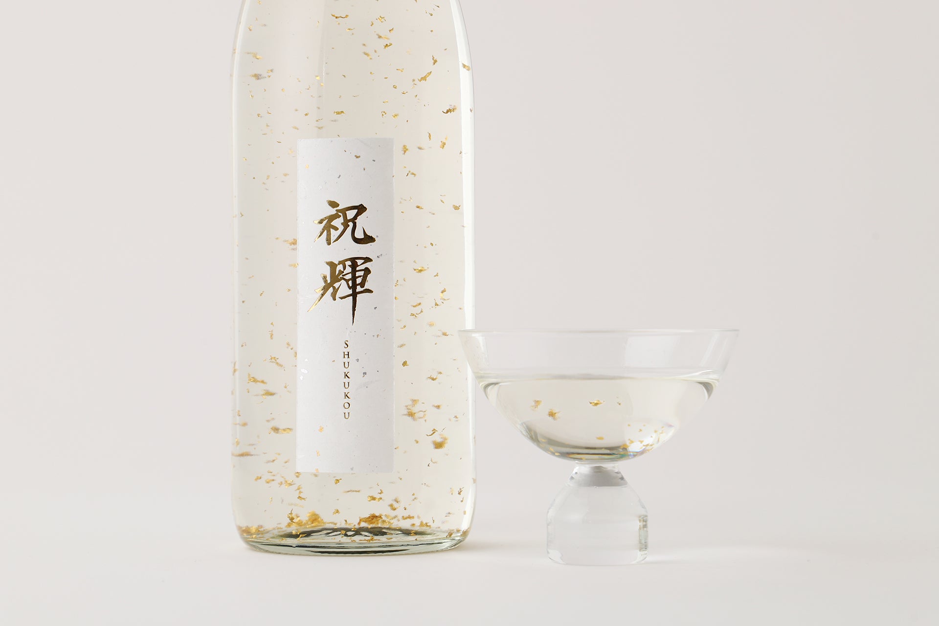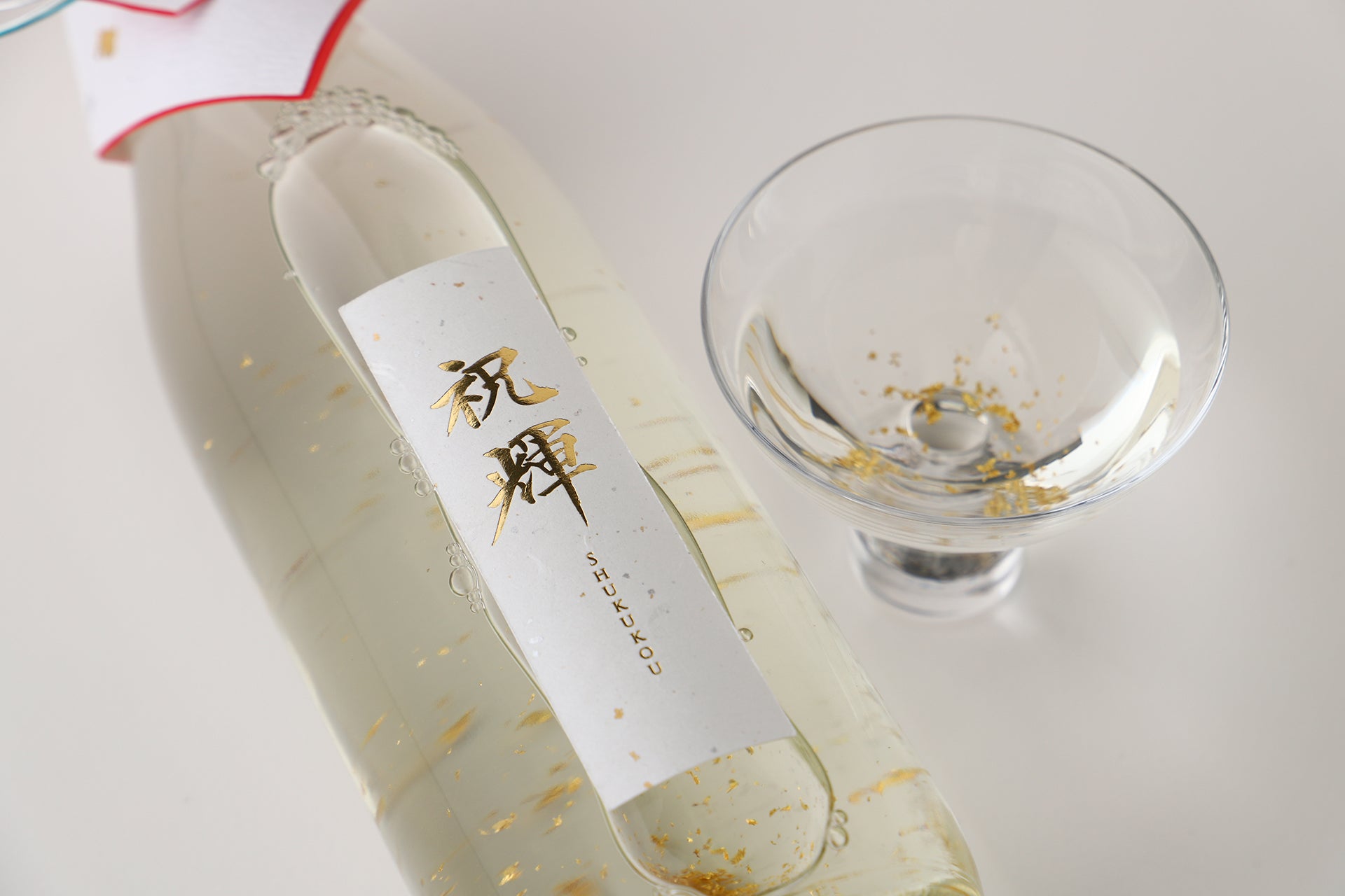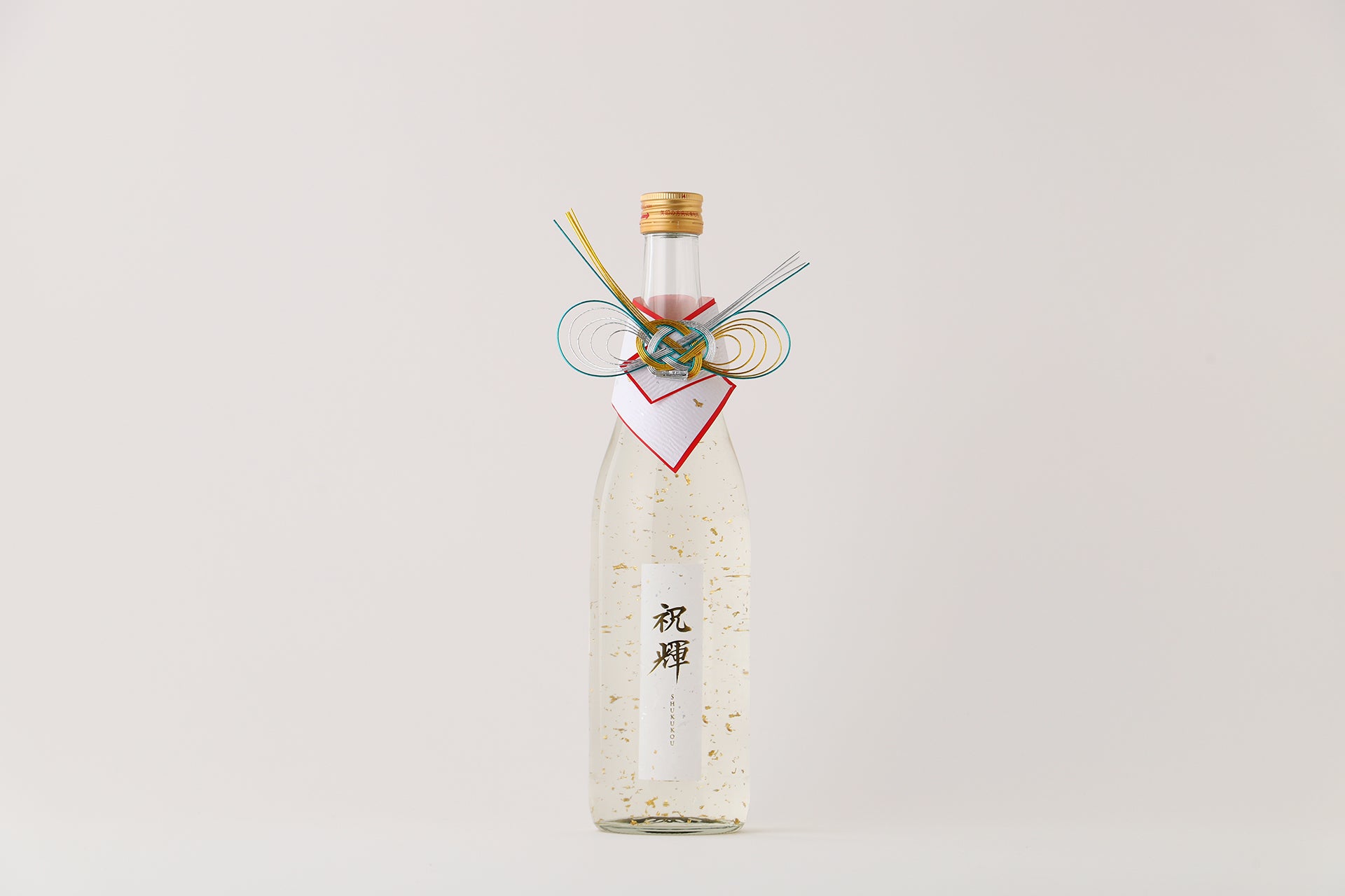 「祝輝 -Shukukou-」は、「大切な人への贈り物となる1本を」をテーマに開発した純米吟醸酒です。日本酒の中に金箔を入れることで、淡い金色に光が反射し、まるで日本酒が輝いているかのような様子を生み出しました。グラスに注ぐと金箔がふわりと踊り出し、飲む人の笑顔をやさしく照らします。ボトルの首には「人と人とを結びつける」という思いを込めて、贈答の場面でも使われる水引をかけました。