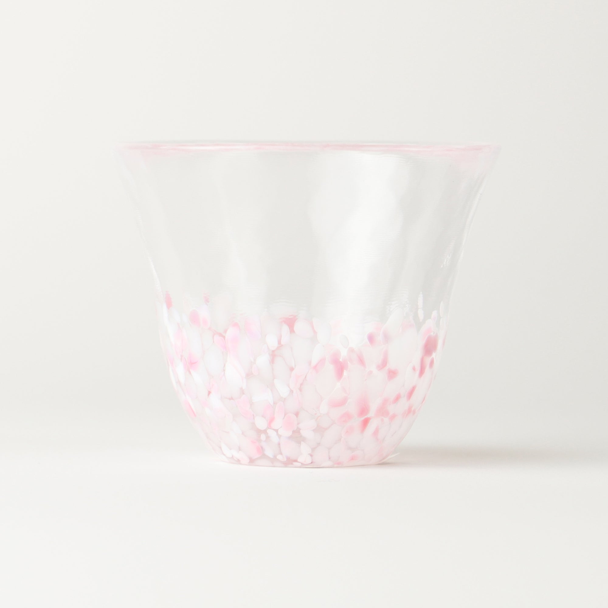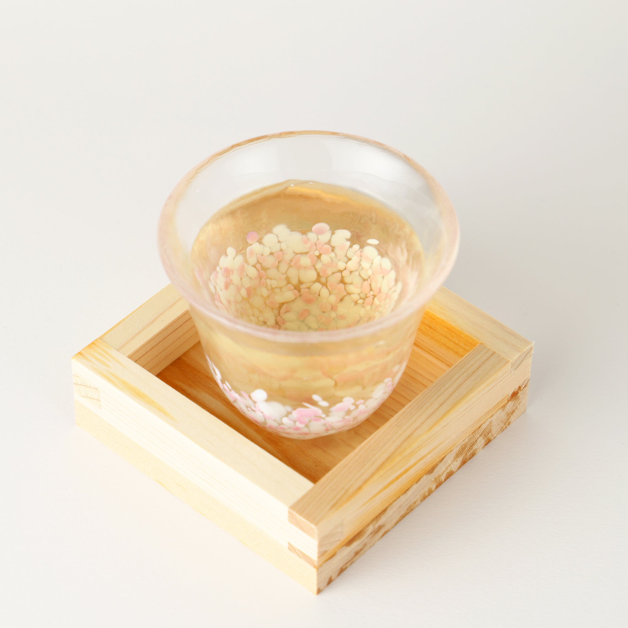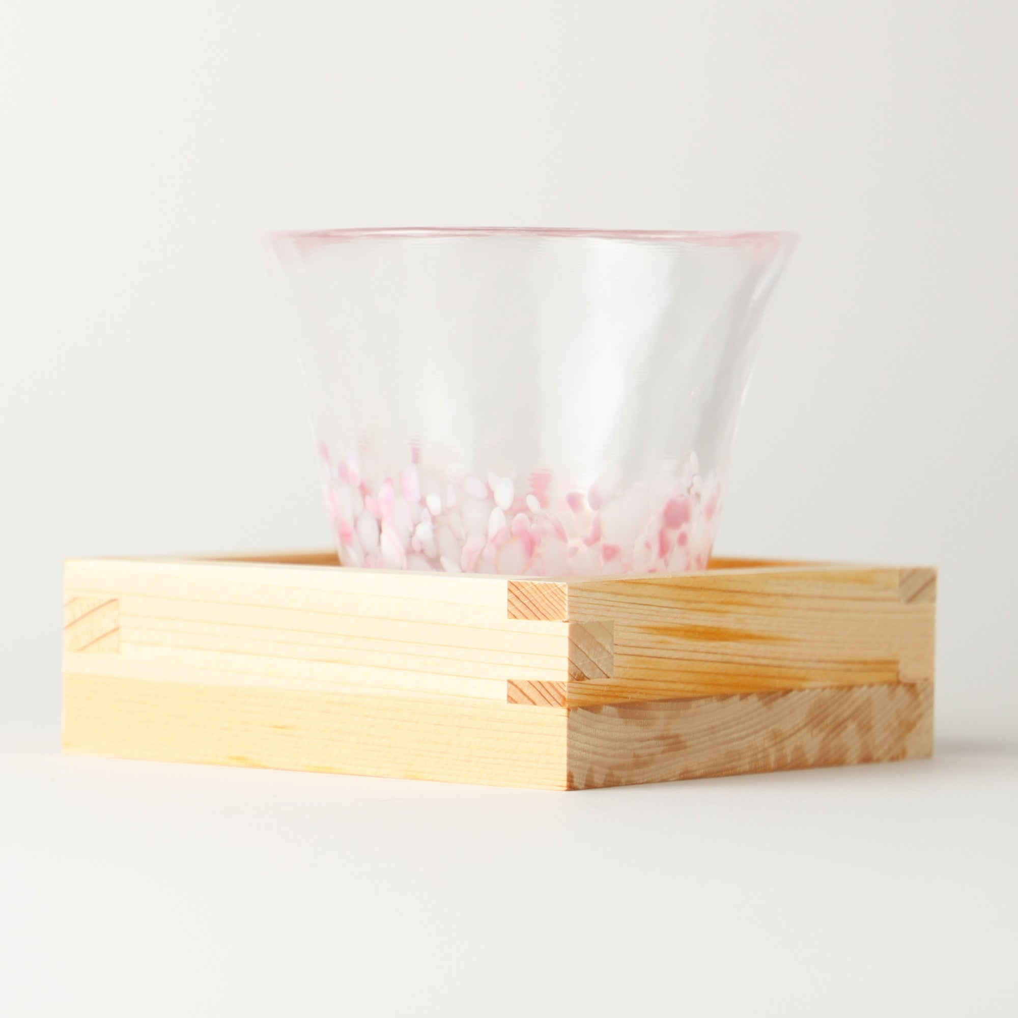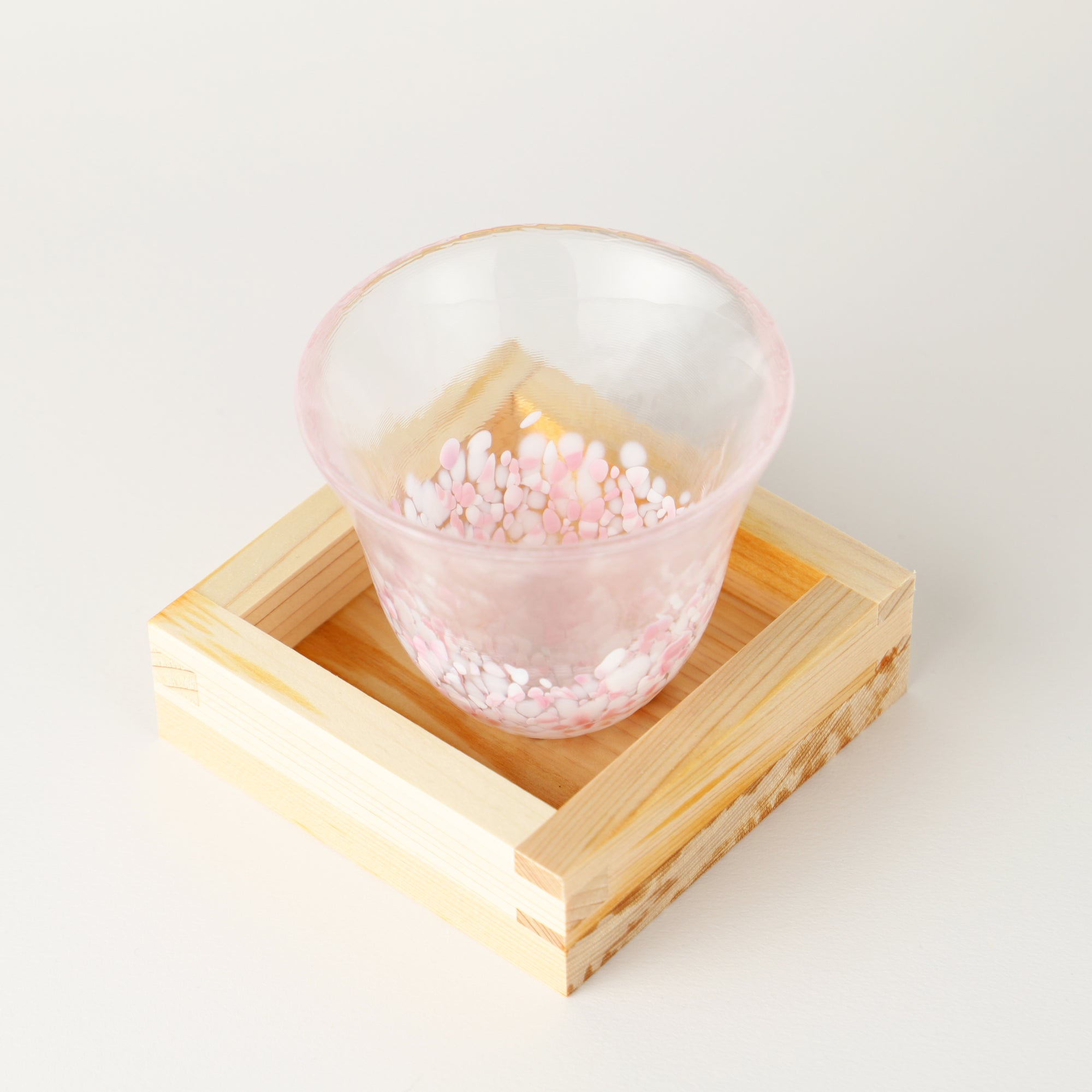 桜の花びらが舞う情景を映した、美しいグラスと枡のセット。鮮やかな桜模様が、晩酌時間を上品に華やげます。