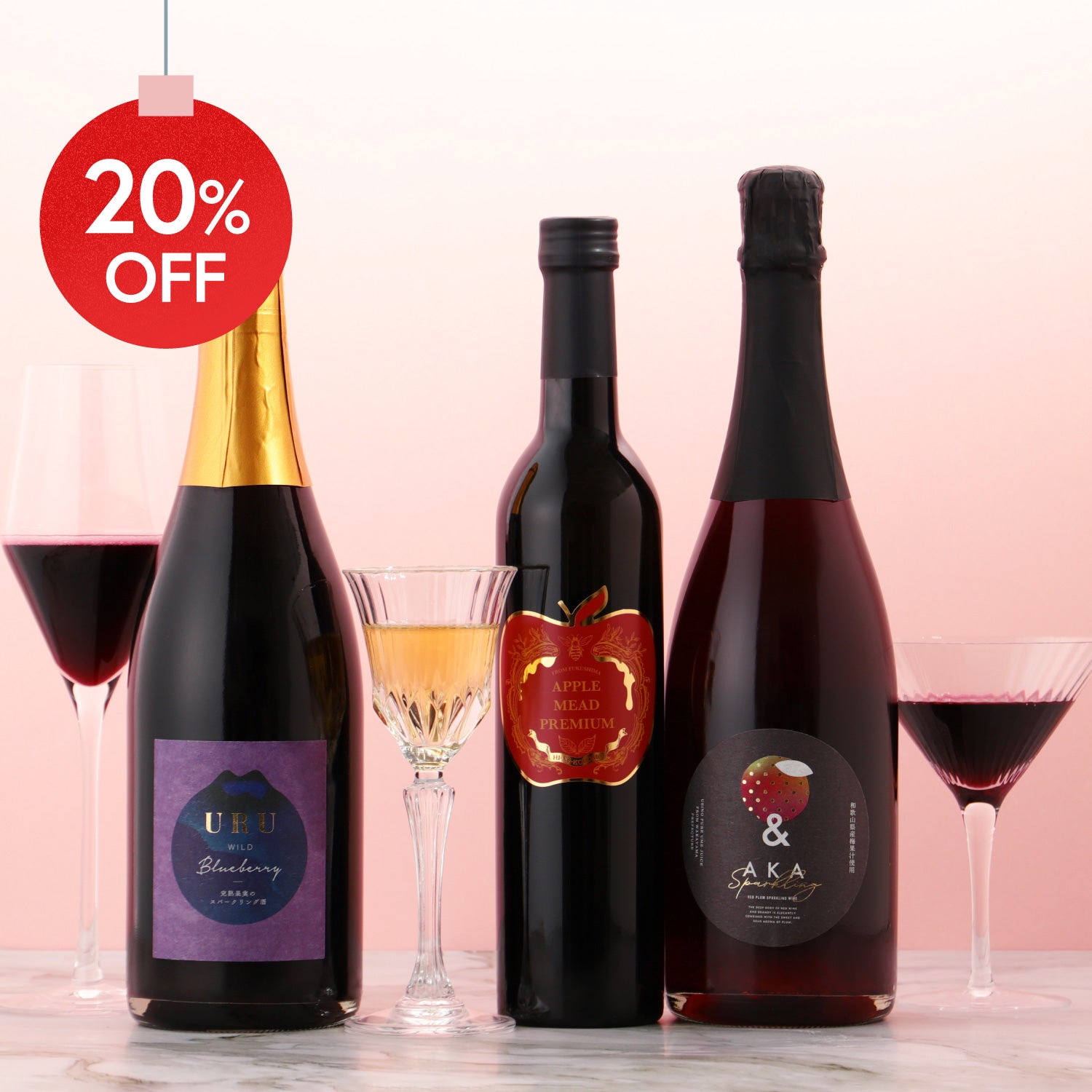 トナカイの鼻のような赤いリンゴを使ったミード、乾杯にぴったりなスパークリング梅酒、クリスマスの食事と相性抜群の完熟ブルーベリーのスパークリング酒。クリスマスを彩る甘くて贅沢なお酒を、単品で購入するよりも20%OFFでお得に楽しめるセットです。